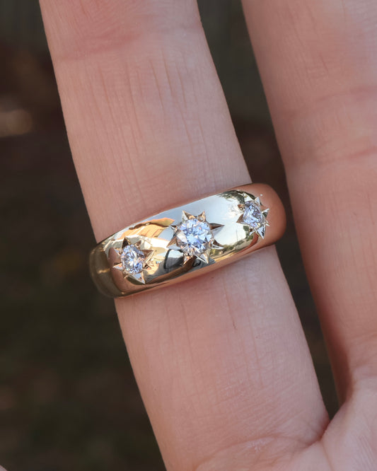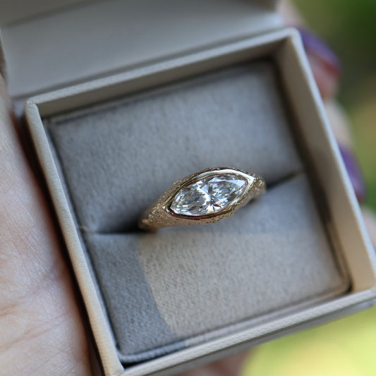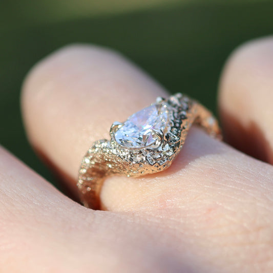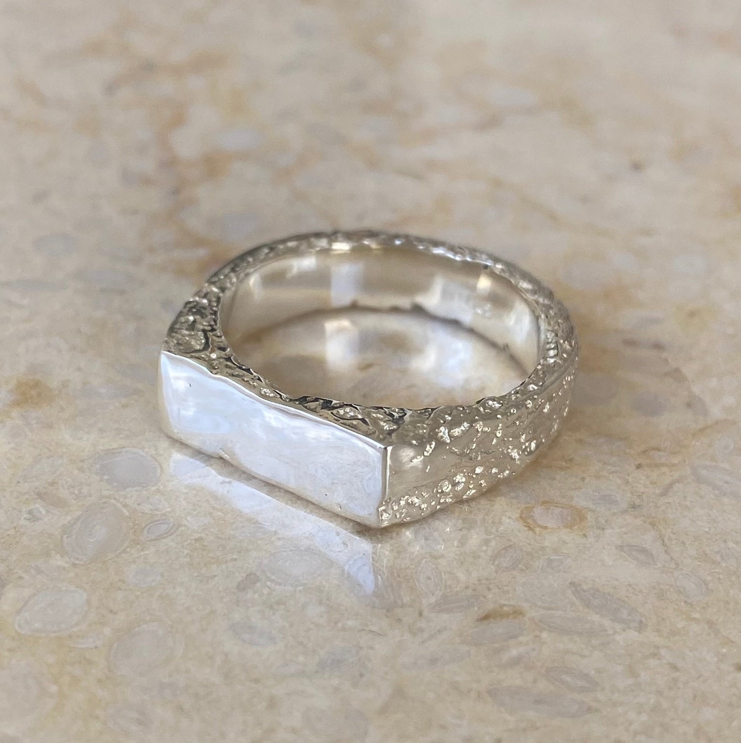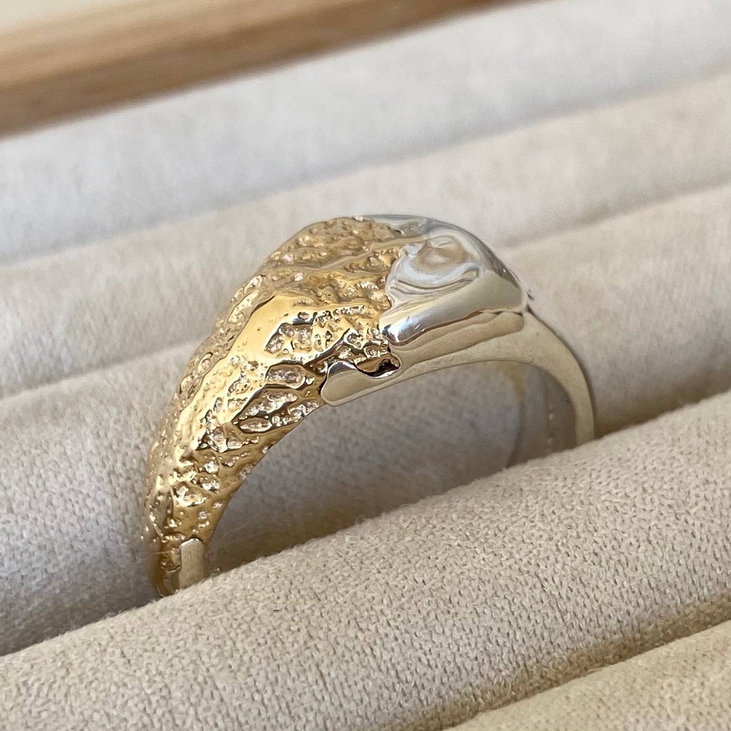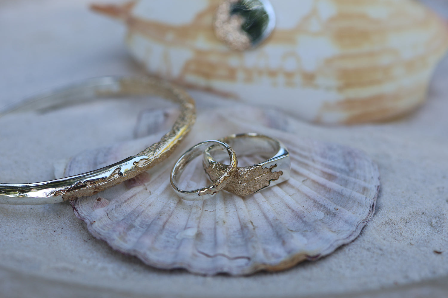 Inspired by the beautiful shorelines in North Queensland the textured yellow gold represents sand and the high polished silver represents the water coming in at the beach. Each ring is individually sand cast to achieve this organic and unique texture and look.