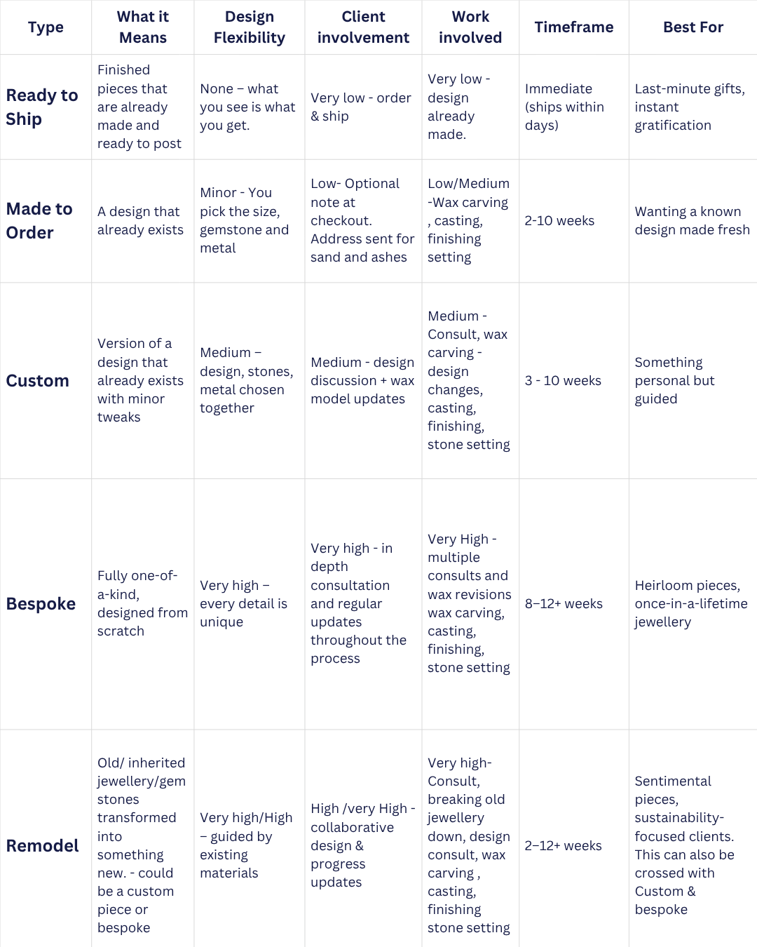 Going forward, I won’t be working within fixed timeframes unless it’s for something with a clear deadline (like a wedding or special event). Otherwise, I want to allow the creative process the space it needs — while still making sure things move forward in a much more consistent and structured way than before. sometimes a piece can take a day and other times it an take months depending on the design and level of details involved . Jewellery is something that is made to last a lifetime and I believe it deserves patience, care and intention - not to be rushed.