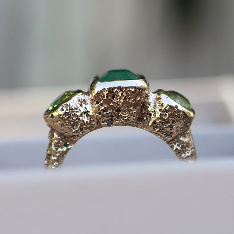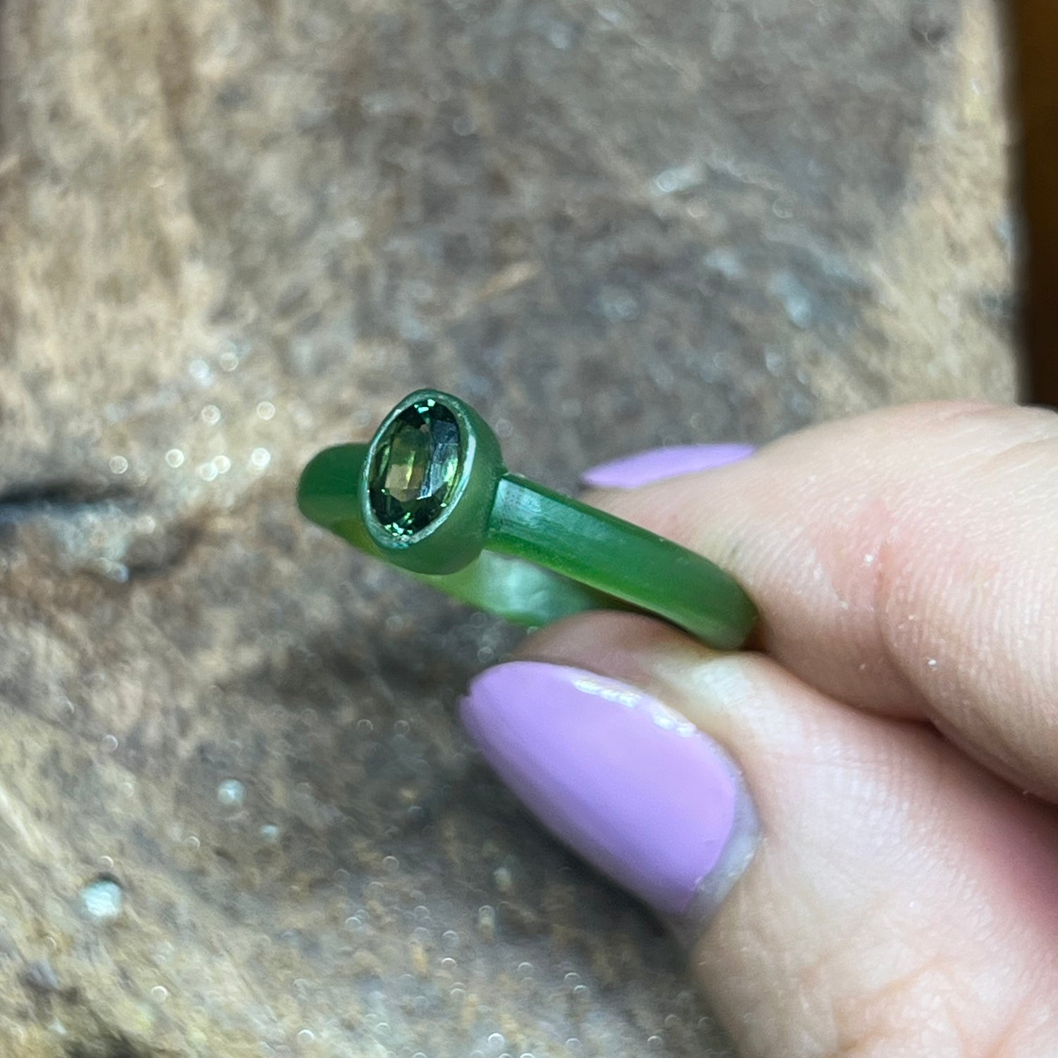 Memorial Shoreline Ring using my clients sentimental gold, gemstone and ashes from her grandfather to add texture to the yellow gold section of the ring.