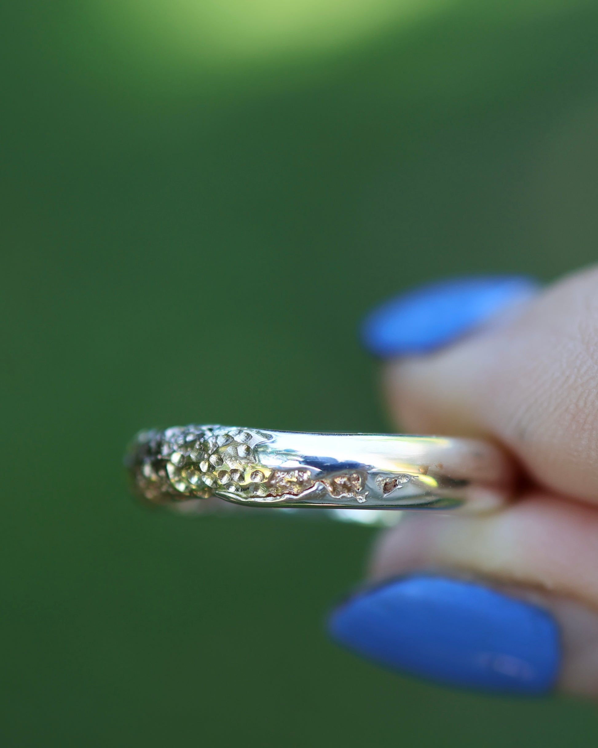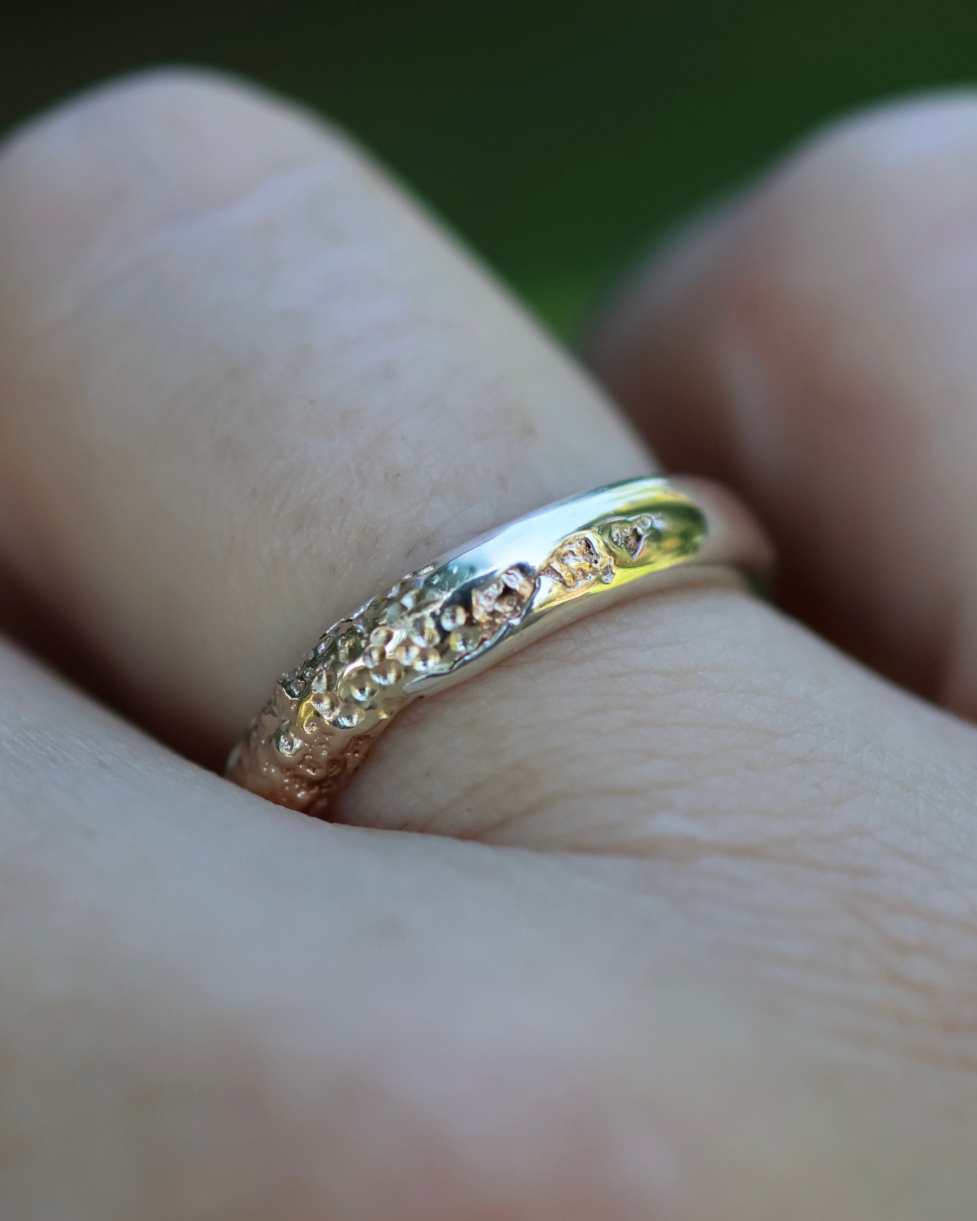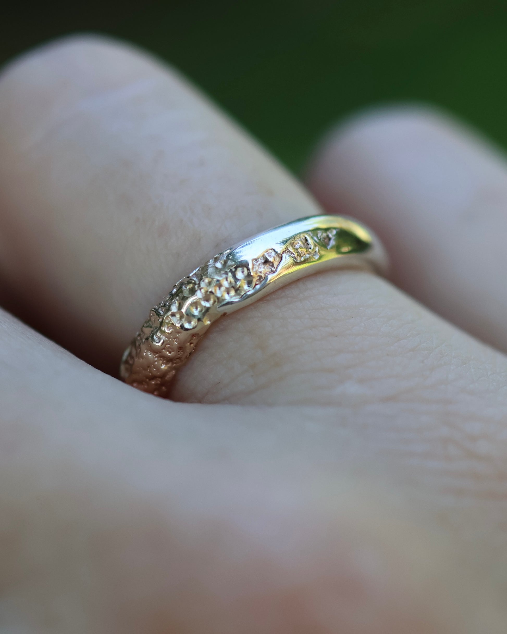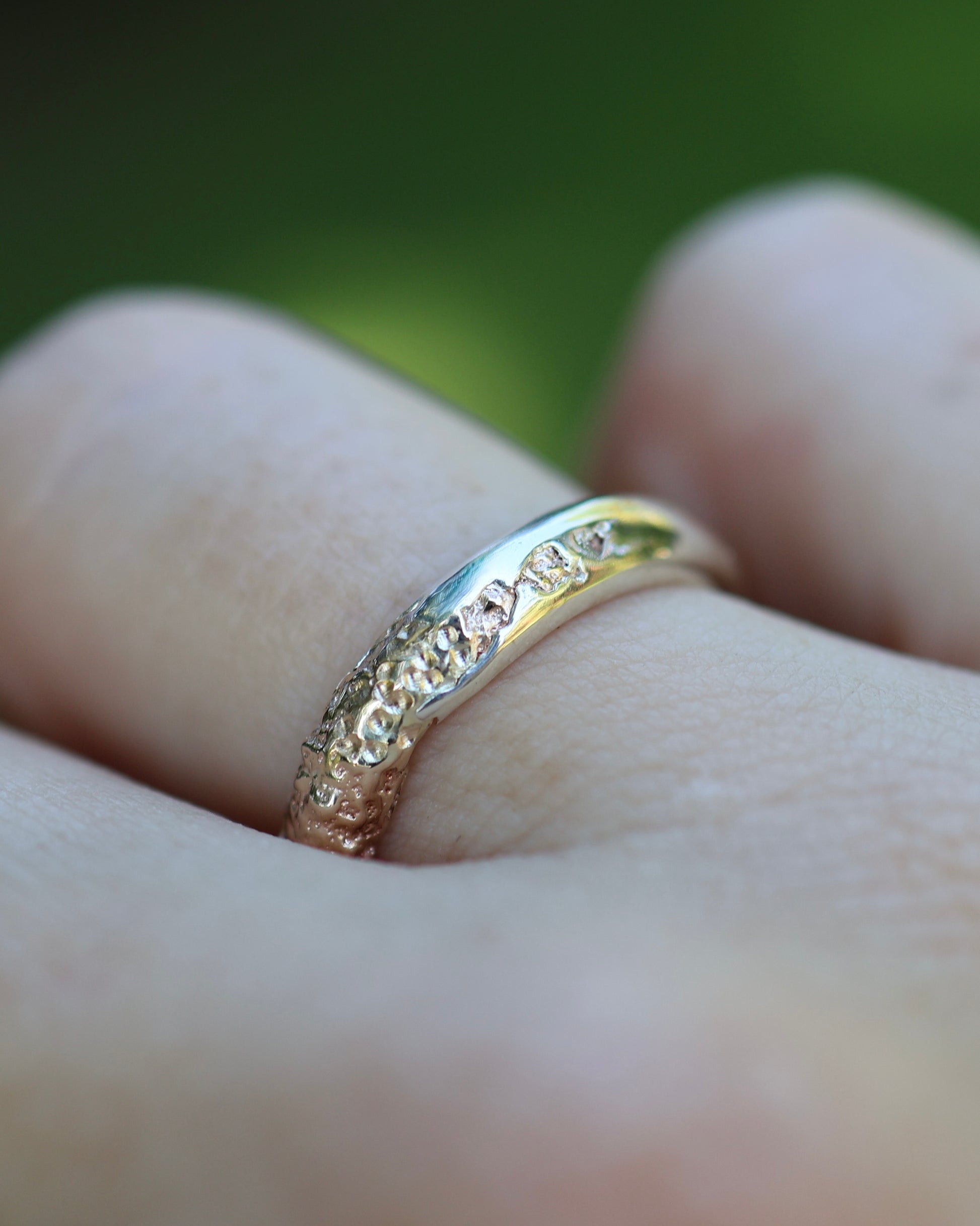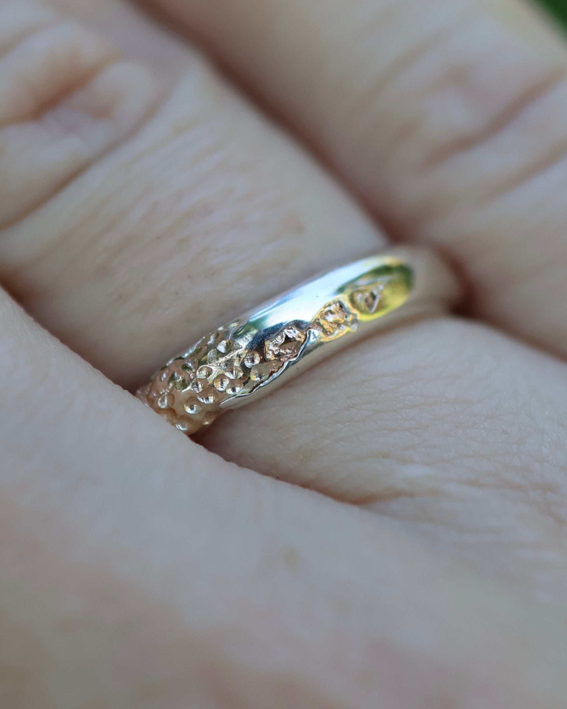 This collection was inspired by the beautiful shorelines in North Queensland with the textured yellow gold representing the sand and the high polished silver representing the water coming in at the beach. Each ring is individually sand cast twice to achieve this organic and unique texture and look.