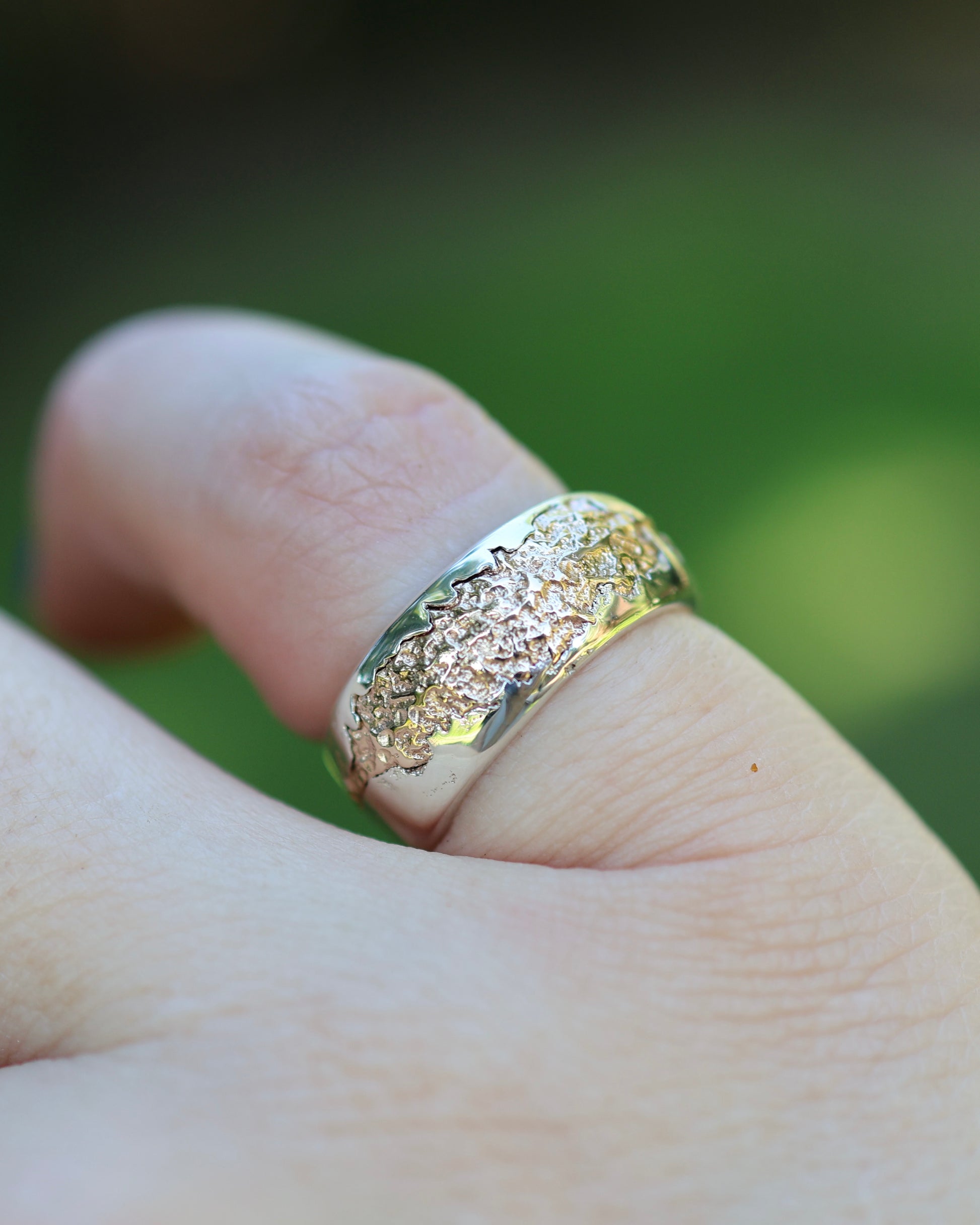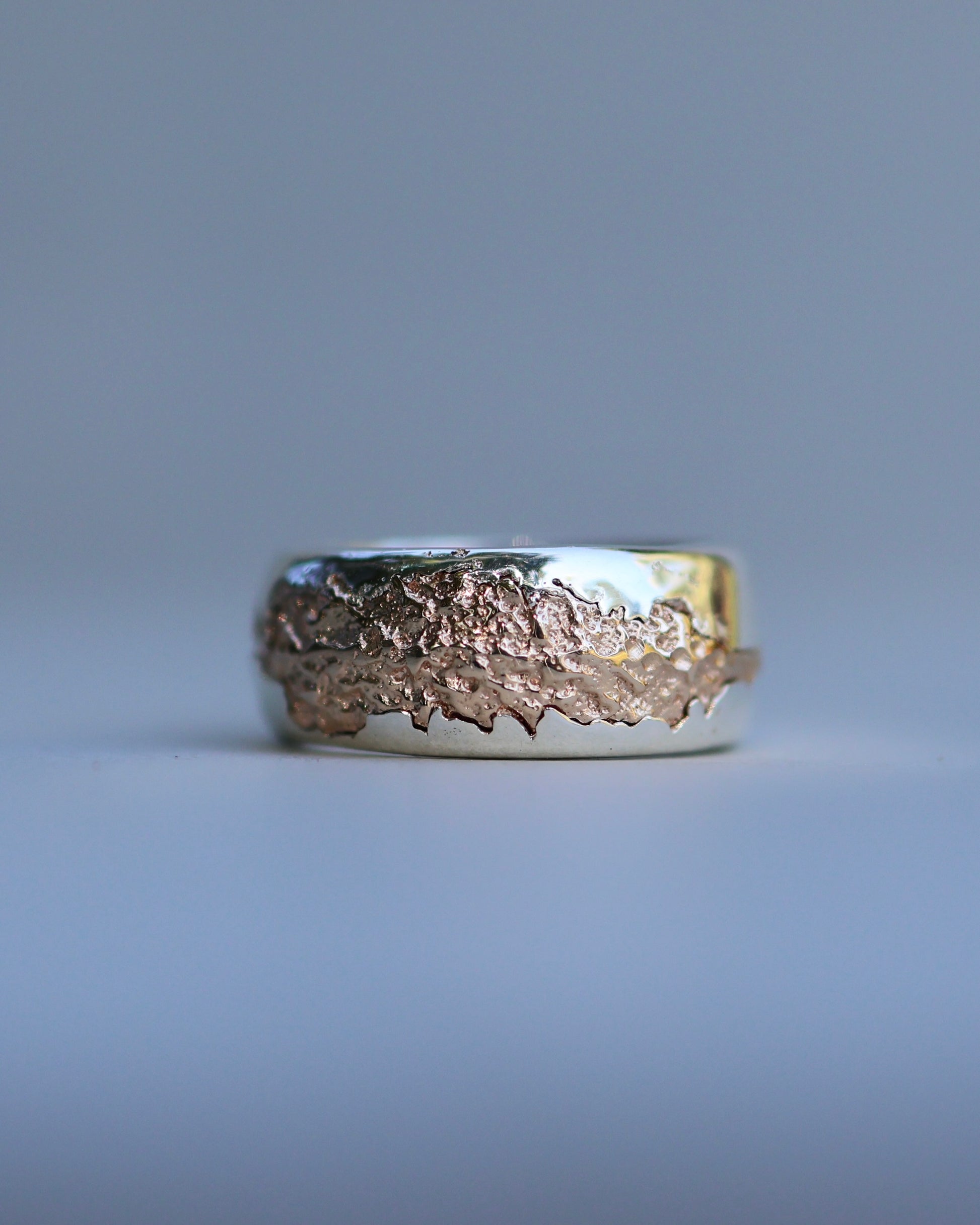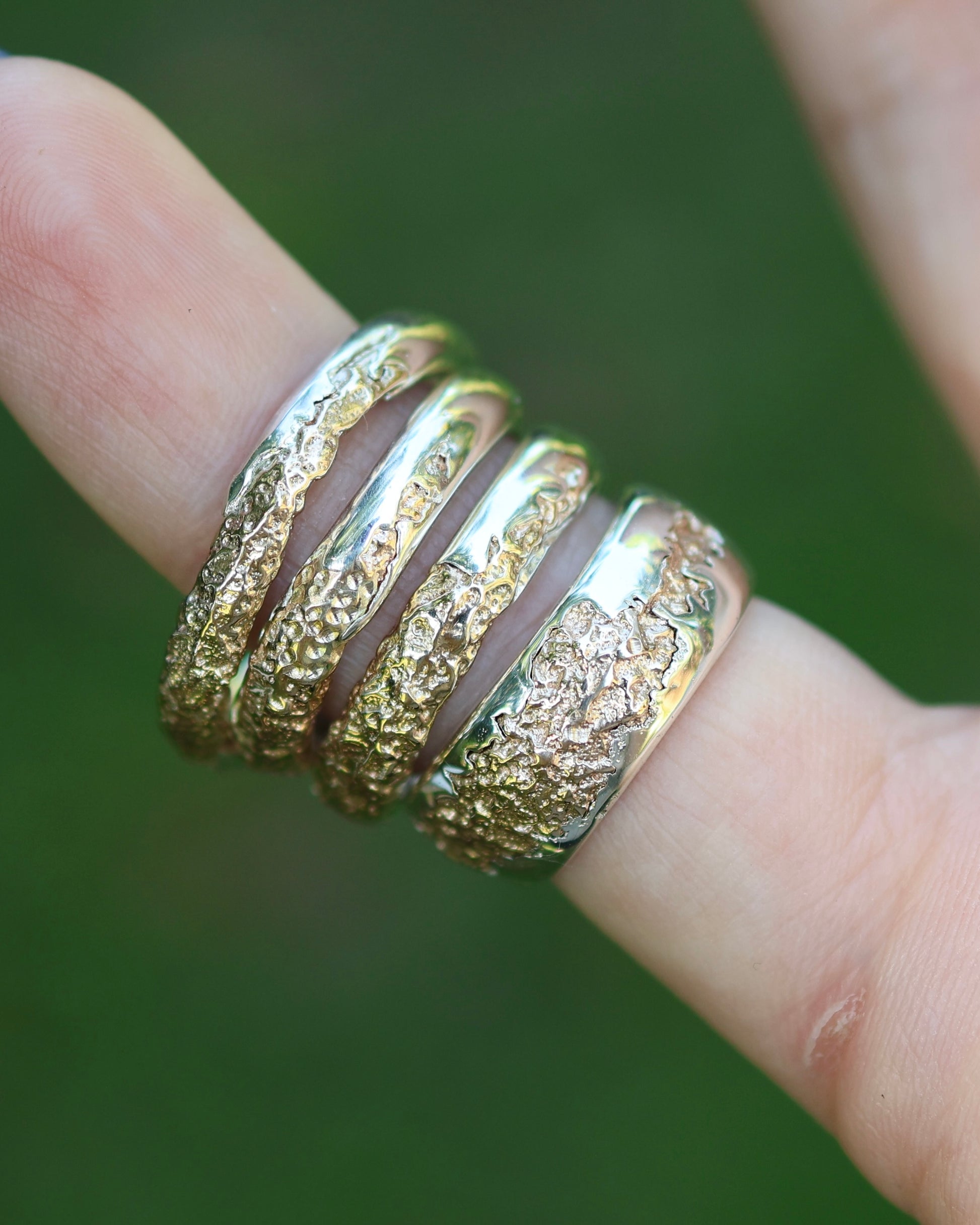 This collection was inspired by the beautiful shorelines in North Queensland with the textured yellow gold representing the sand and the high polished silver representing the water coming in at the beach. Each ring is individually sand cast twice to achieve this organic and unique texture and look.