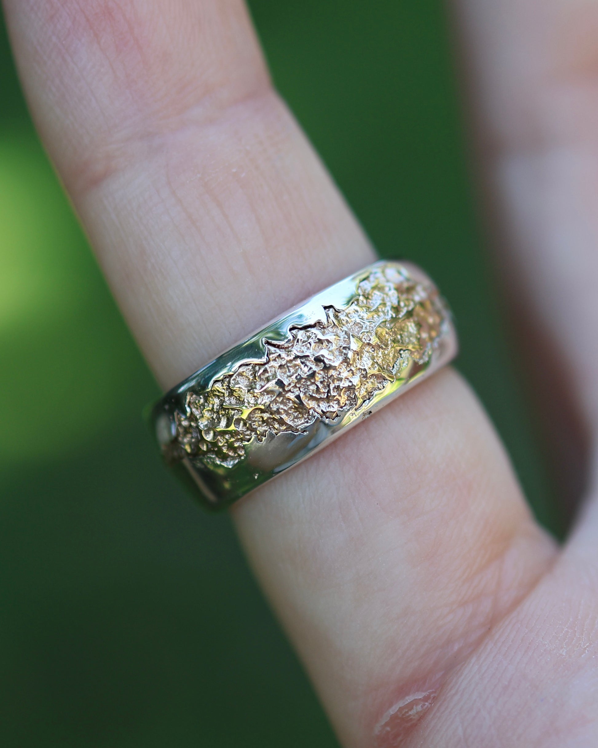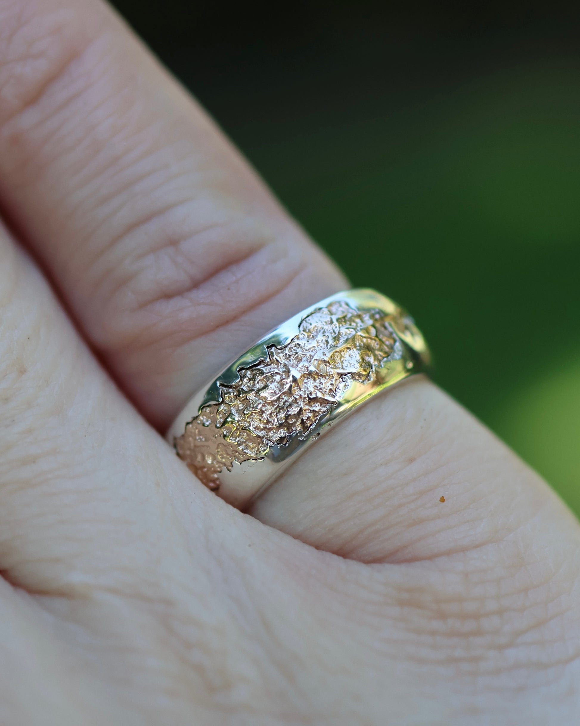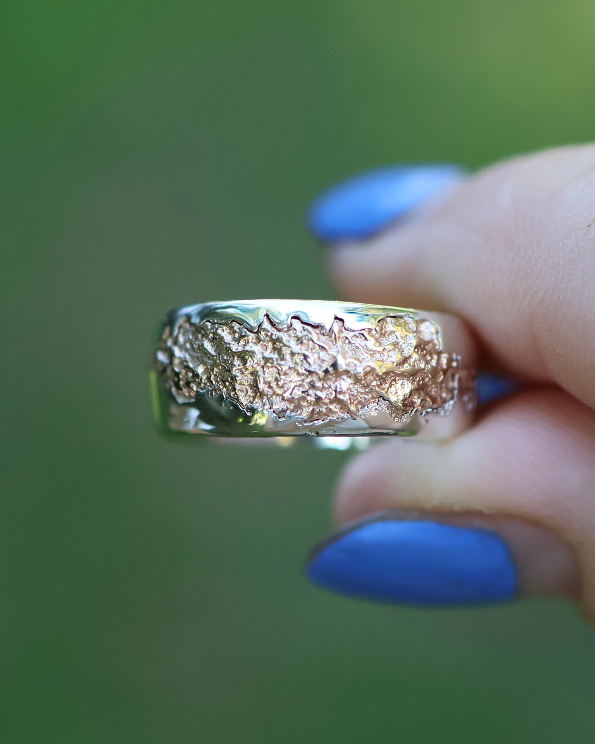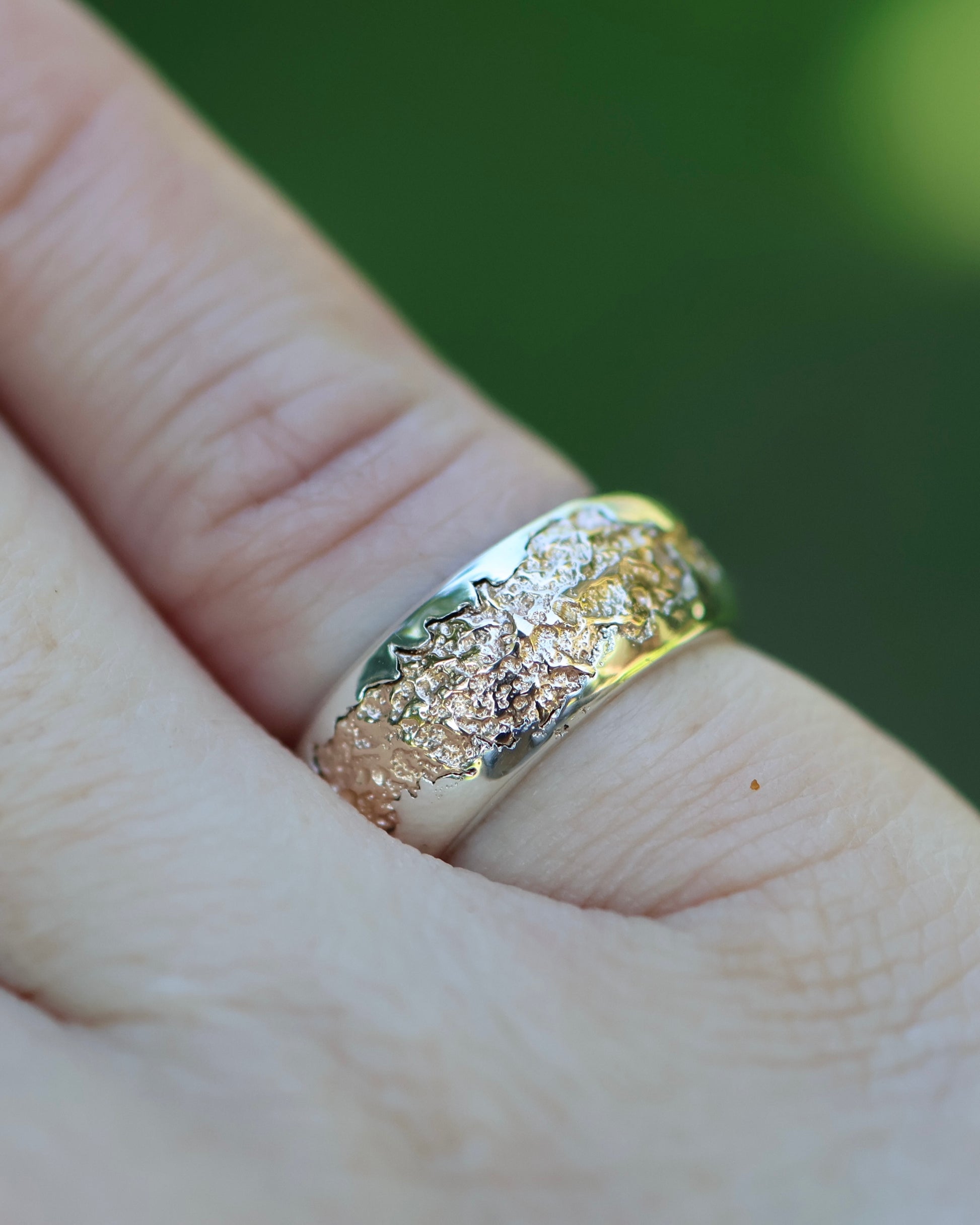 This collection was inspired by the beautiful shorelines in North Queensland with the textured yellow gold representing the sand and the high polished silver representing the water coming in at the beach. Each ring is individually sand cast twice to achieve this organic and unique texture and look.
