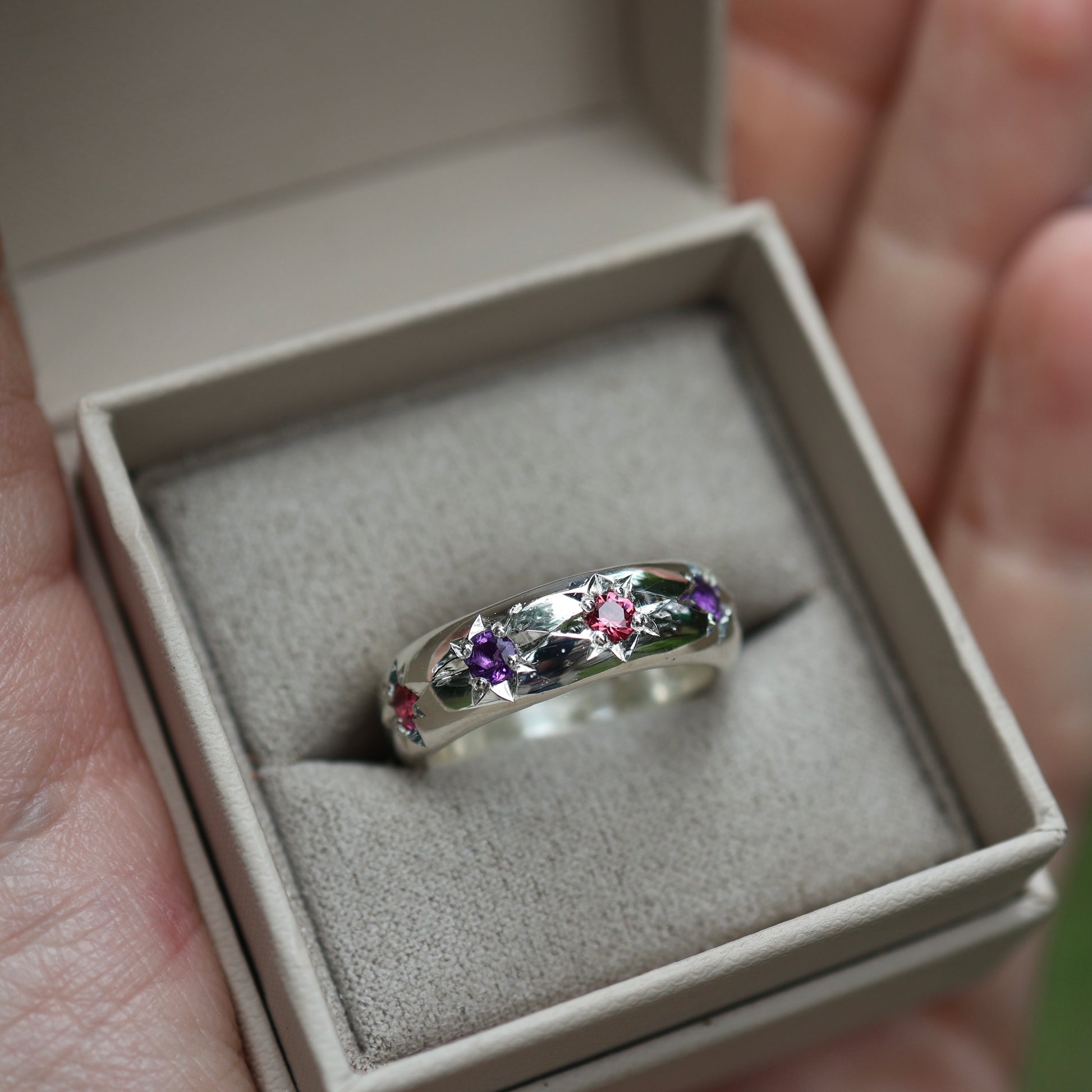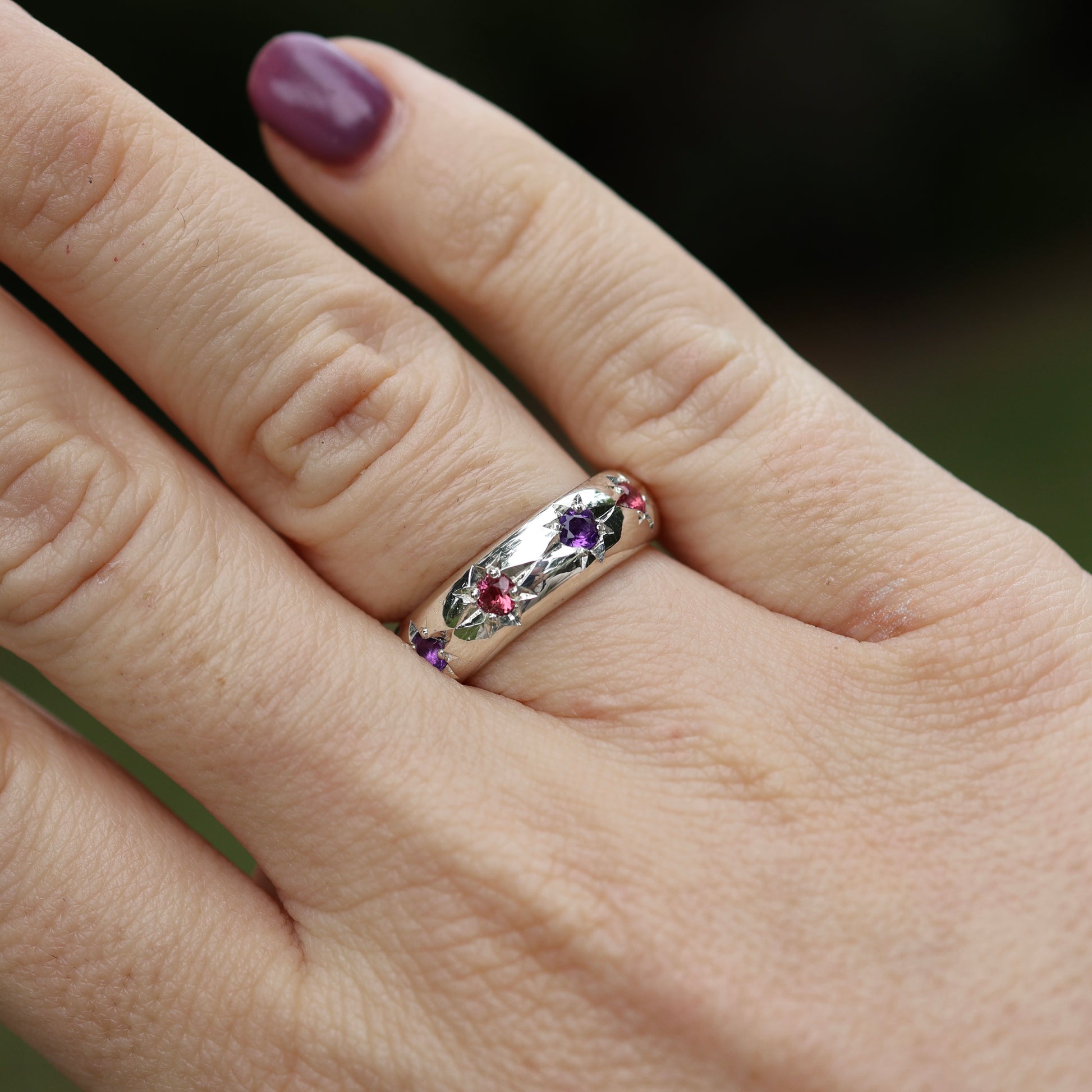 The Astral Hoard ring in the photo is a 7.5 featuring 3 x 3mm Australian garnets and 2 x 3mm Australian amethyst. Can be made 1.5 size larger.