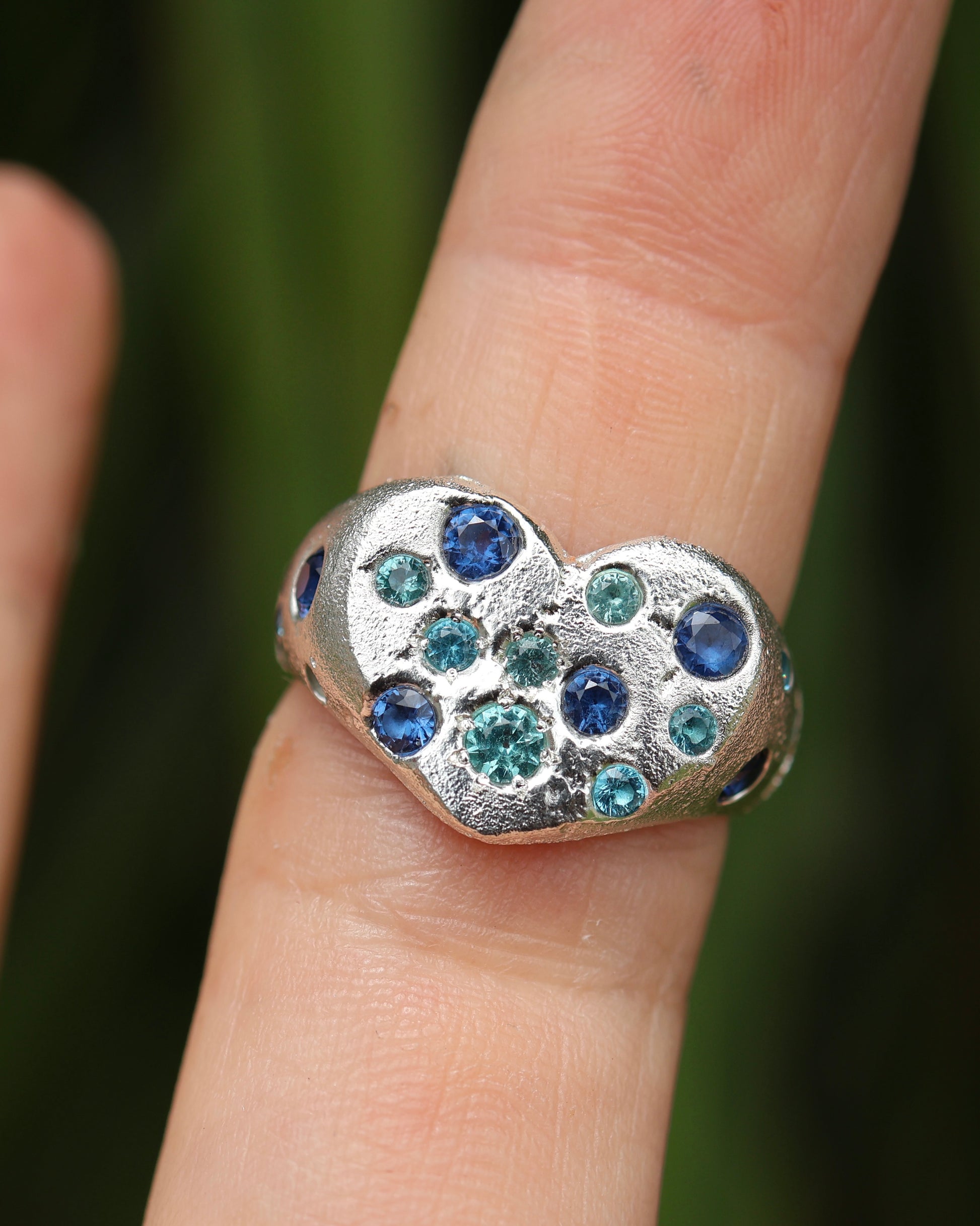 This solid silver signet features a mix of lab grown gemstones that have been cast in place and natural sand casts texture making it truly one of a kind.