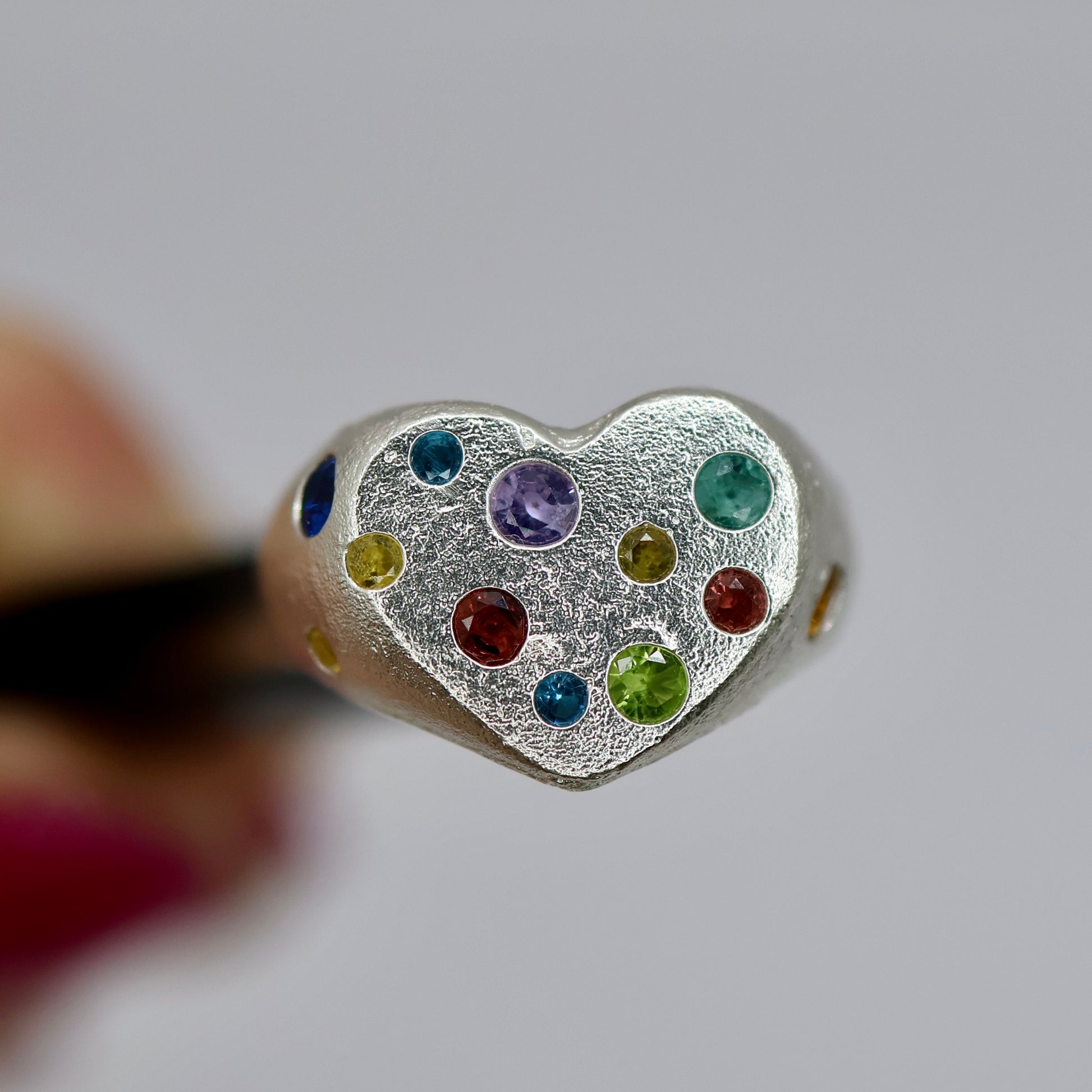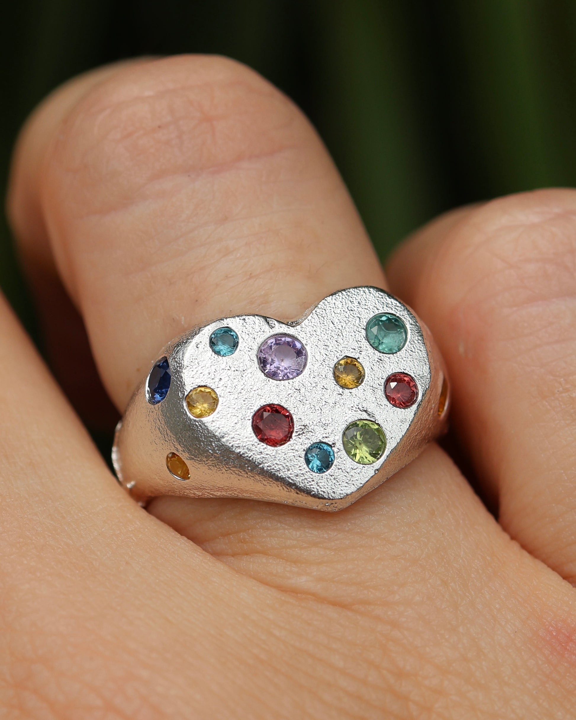 This solid silver signet features a mix of lab grown gemstones that have been cast in place and natural sand casts texture making it truly one of a kind.