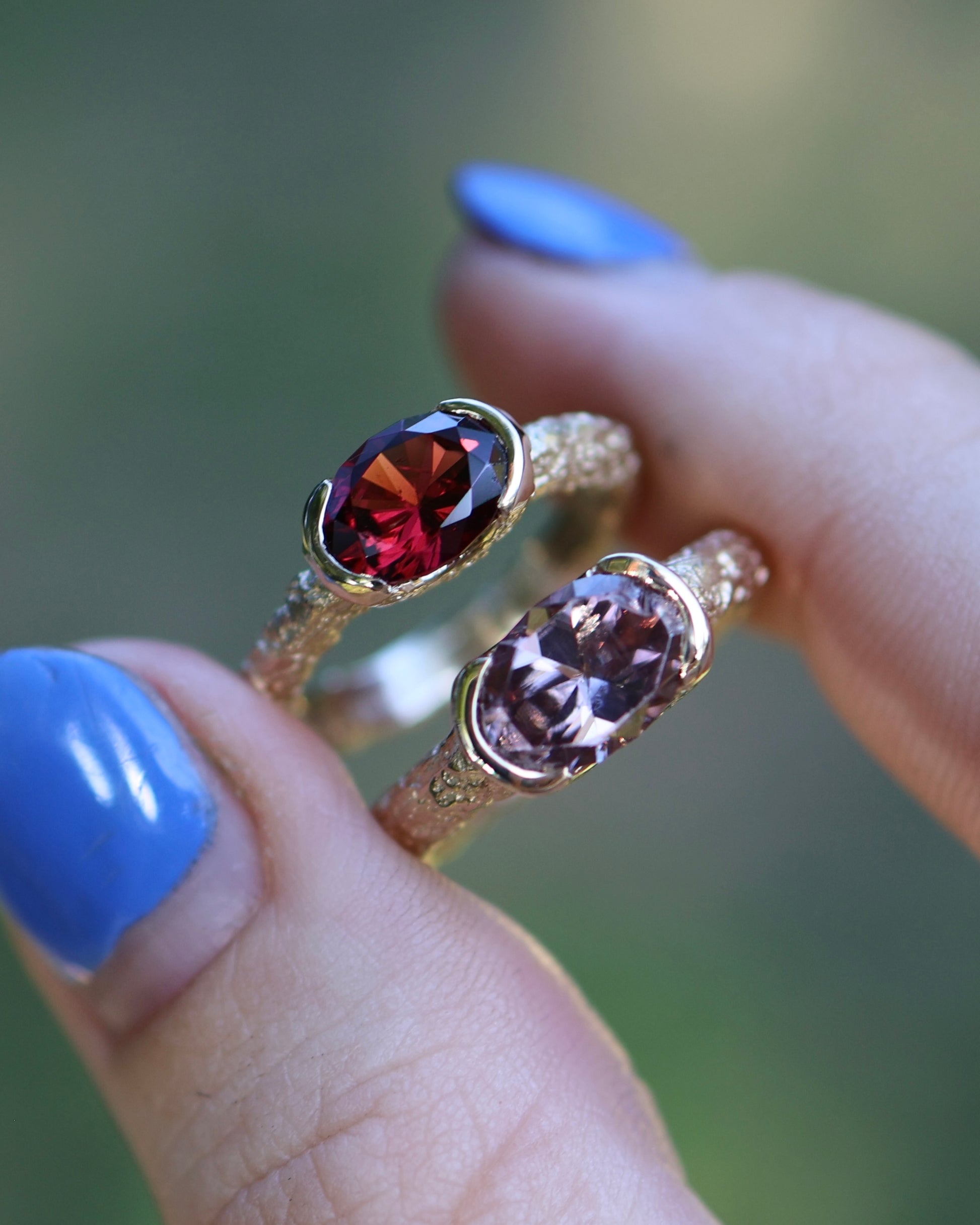 A stunning garnet set in a solid gold sand cast band featuring Nadine Suzannes signature sand cast texture. The setting allows for the light to pass through the stone making the stone the star o the show.