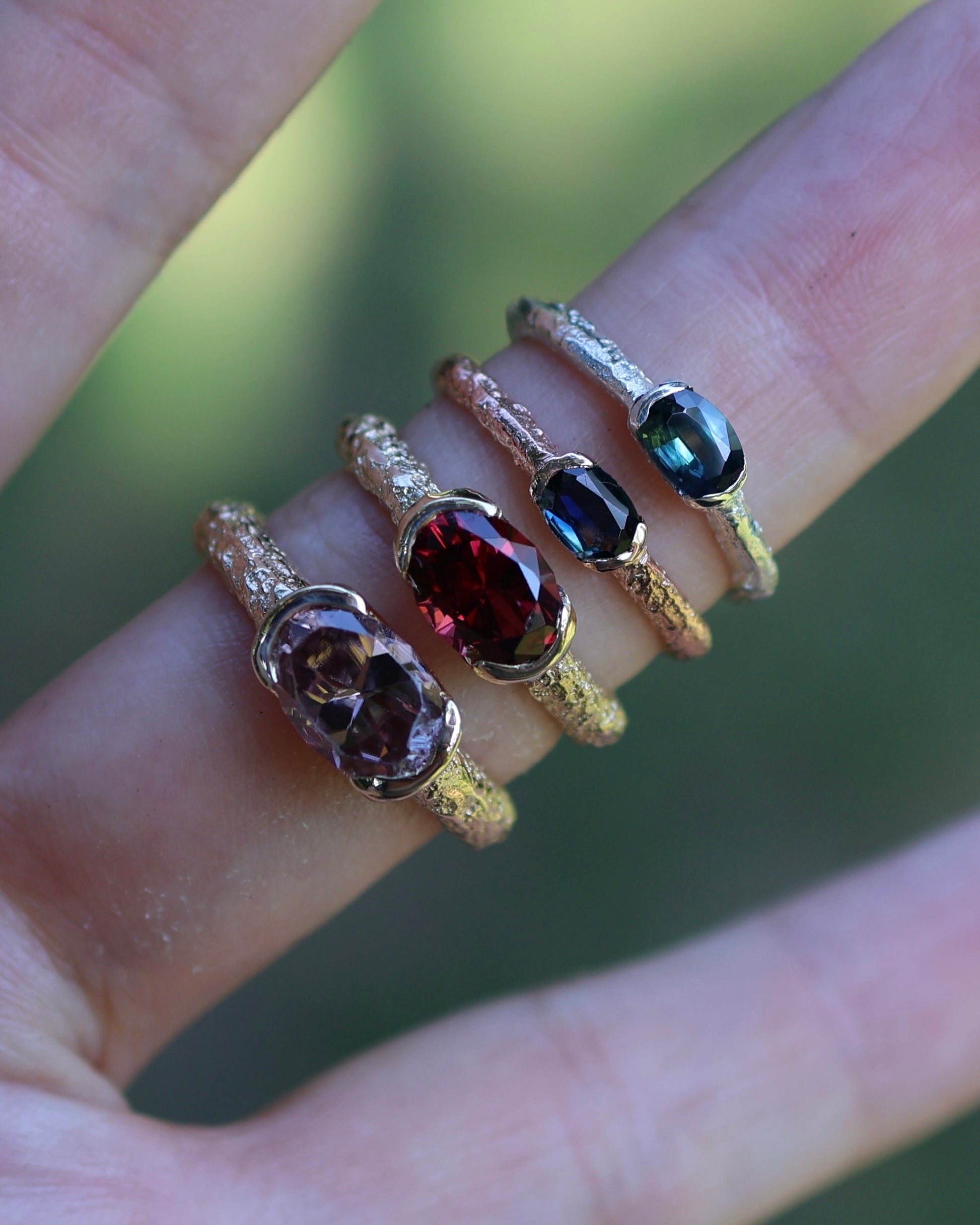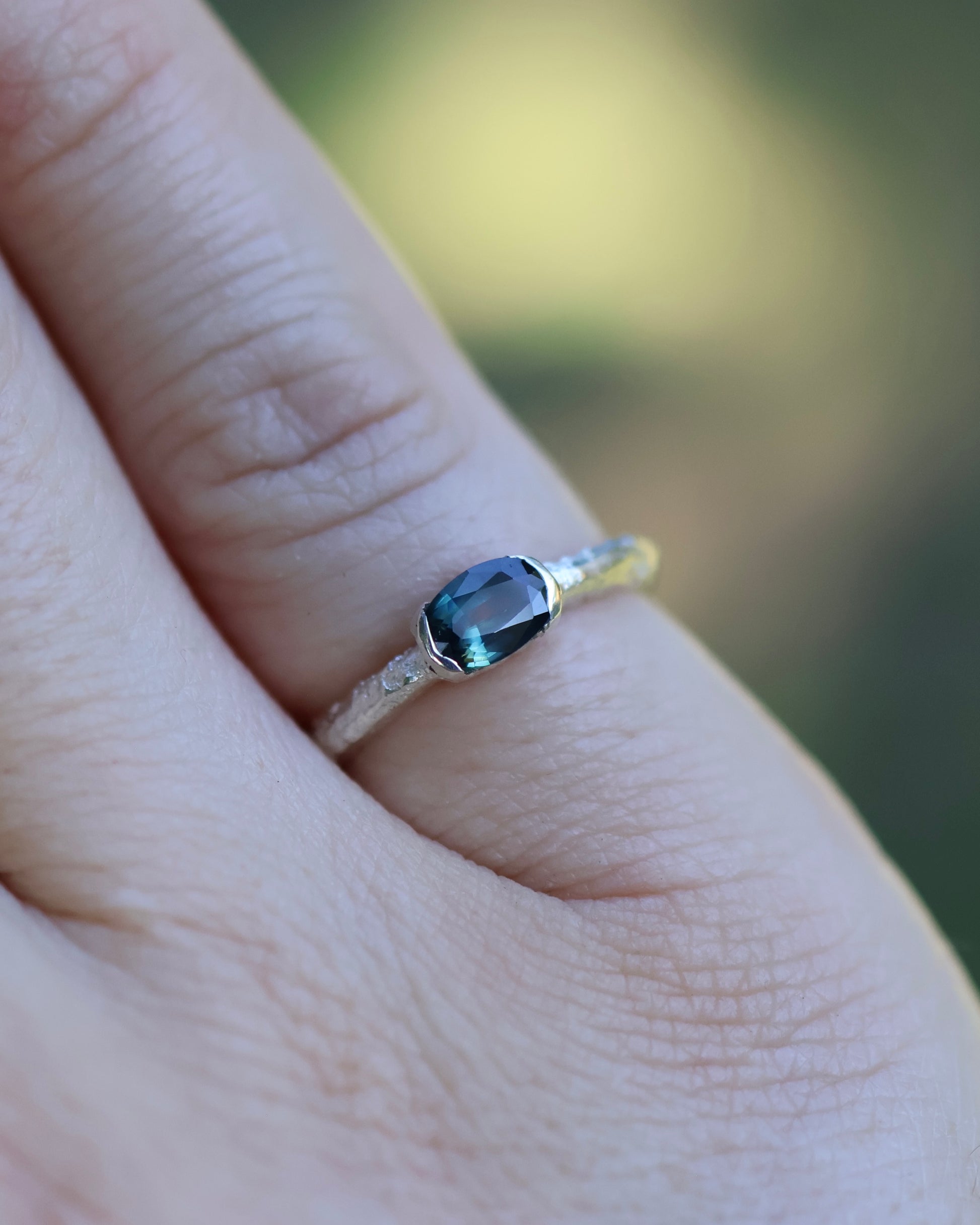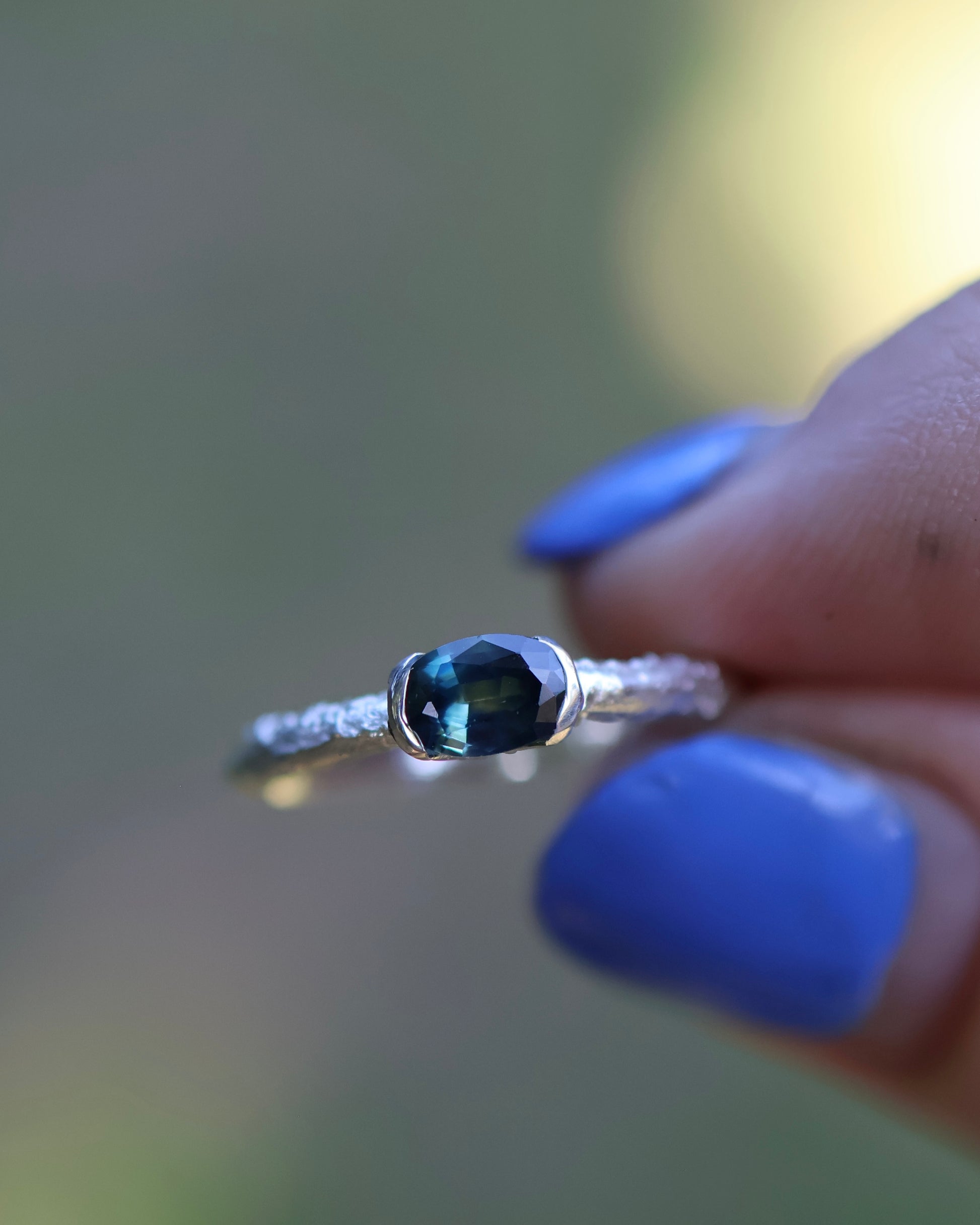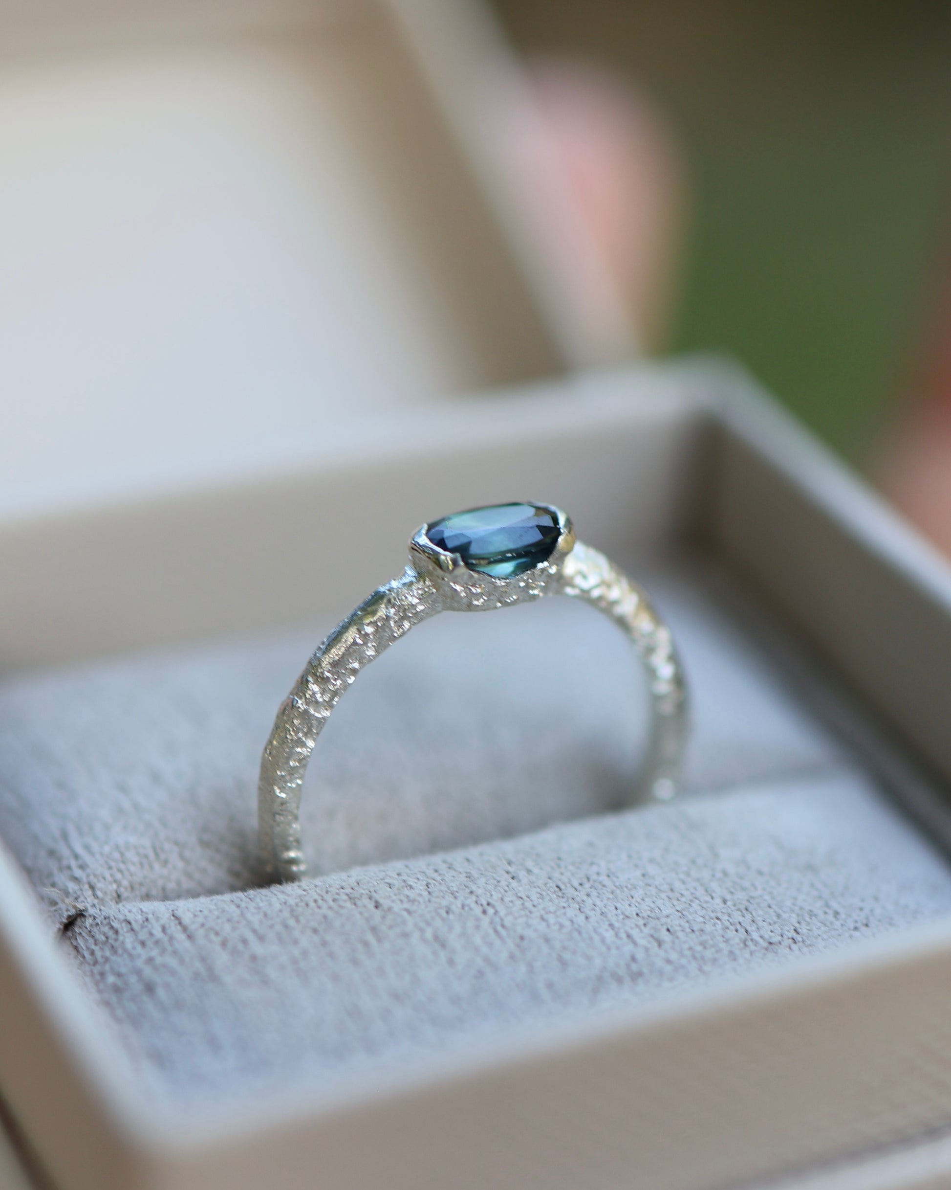 A stunning Australian parti sapphire set in a solid sterling silver sand cast band featuring Nadine Suzannes signature sand cast texture. The setting allows for the light to pass through the stone making the stone the star of the show.