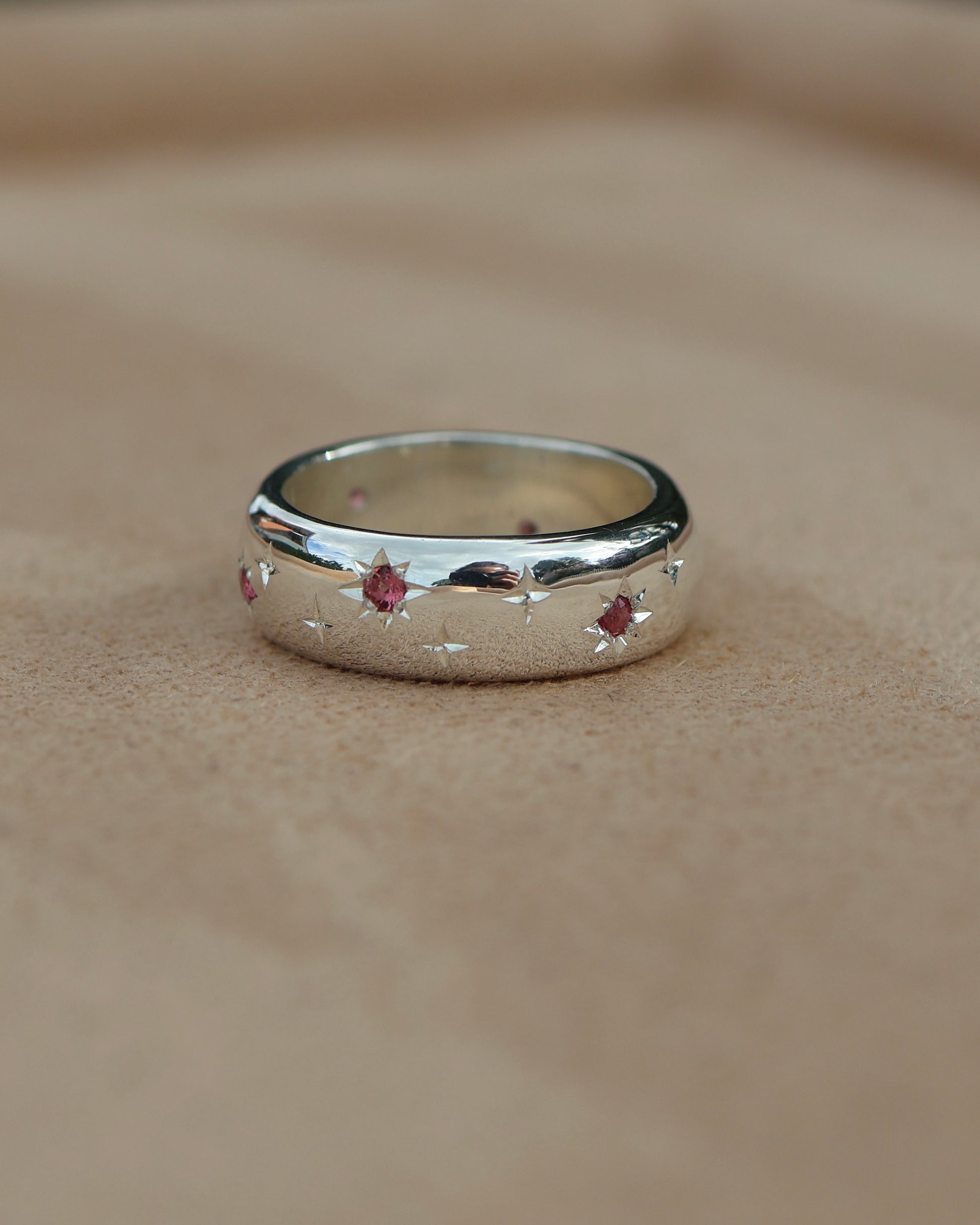 Gemstone: 6 x Garnets with engraved stars in between stones that go around the whole ring