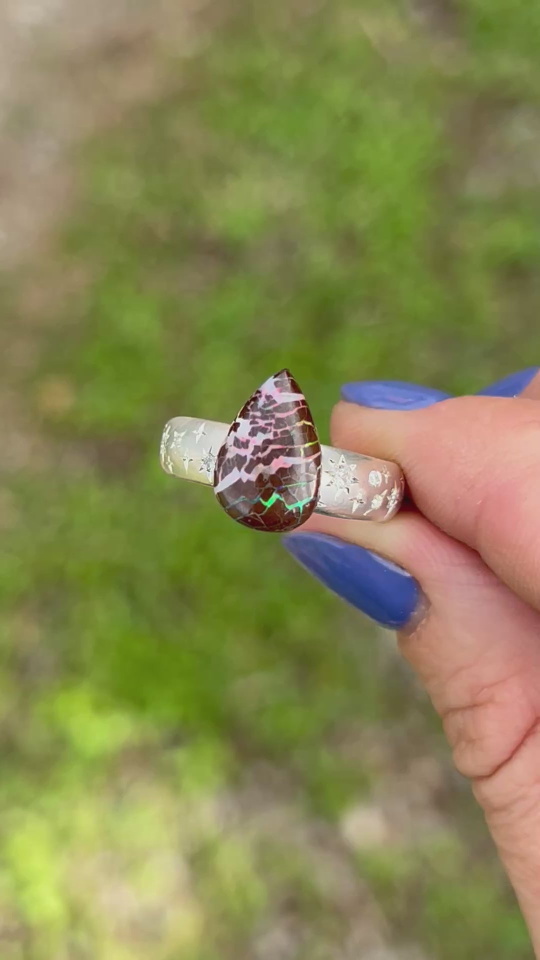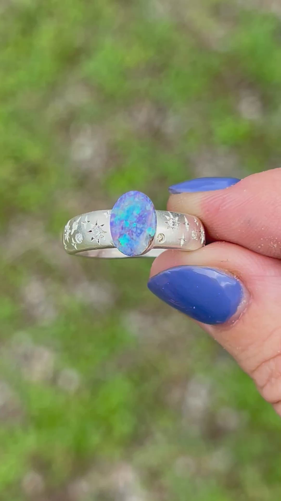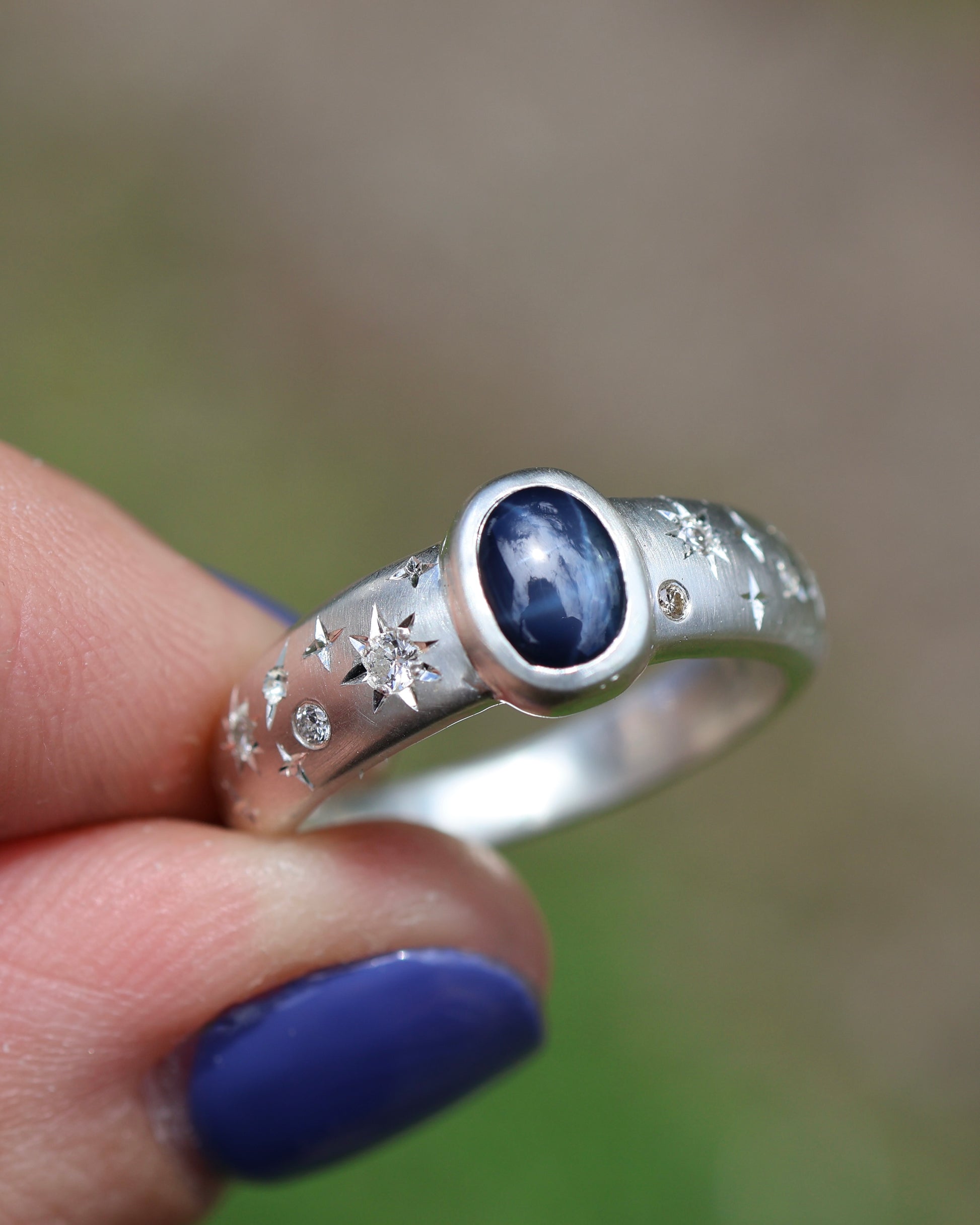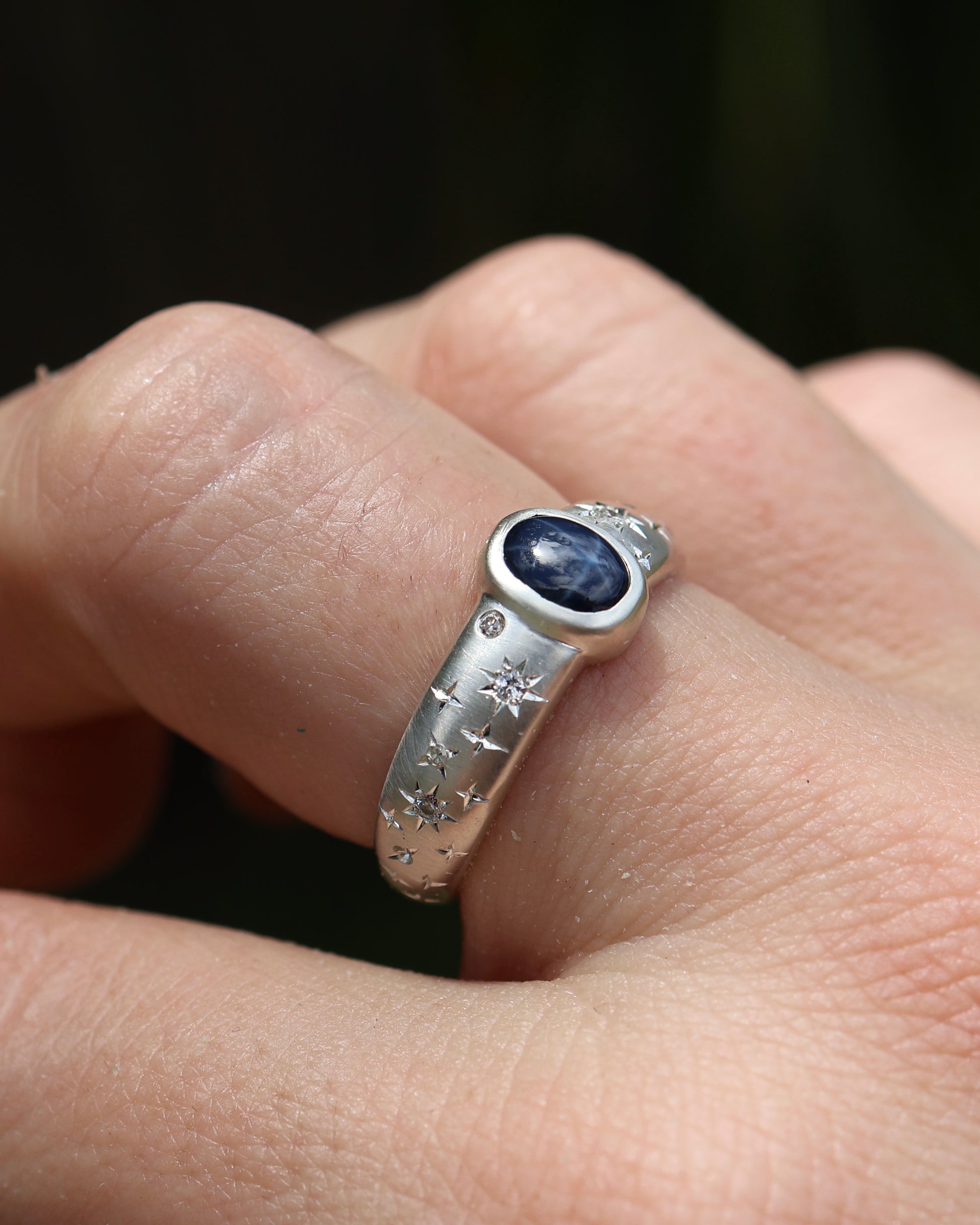 The price reflects the stone set in sterling silver band with 6 lab diamonds scattered on each side amongst an engraved galaxy pattern.