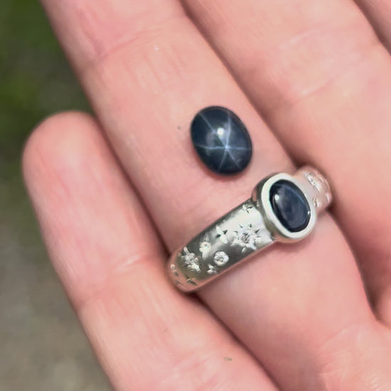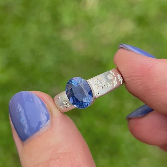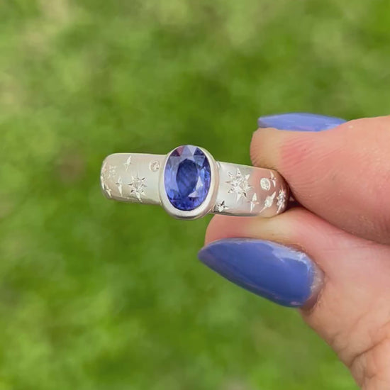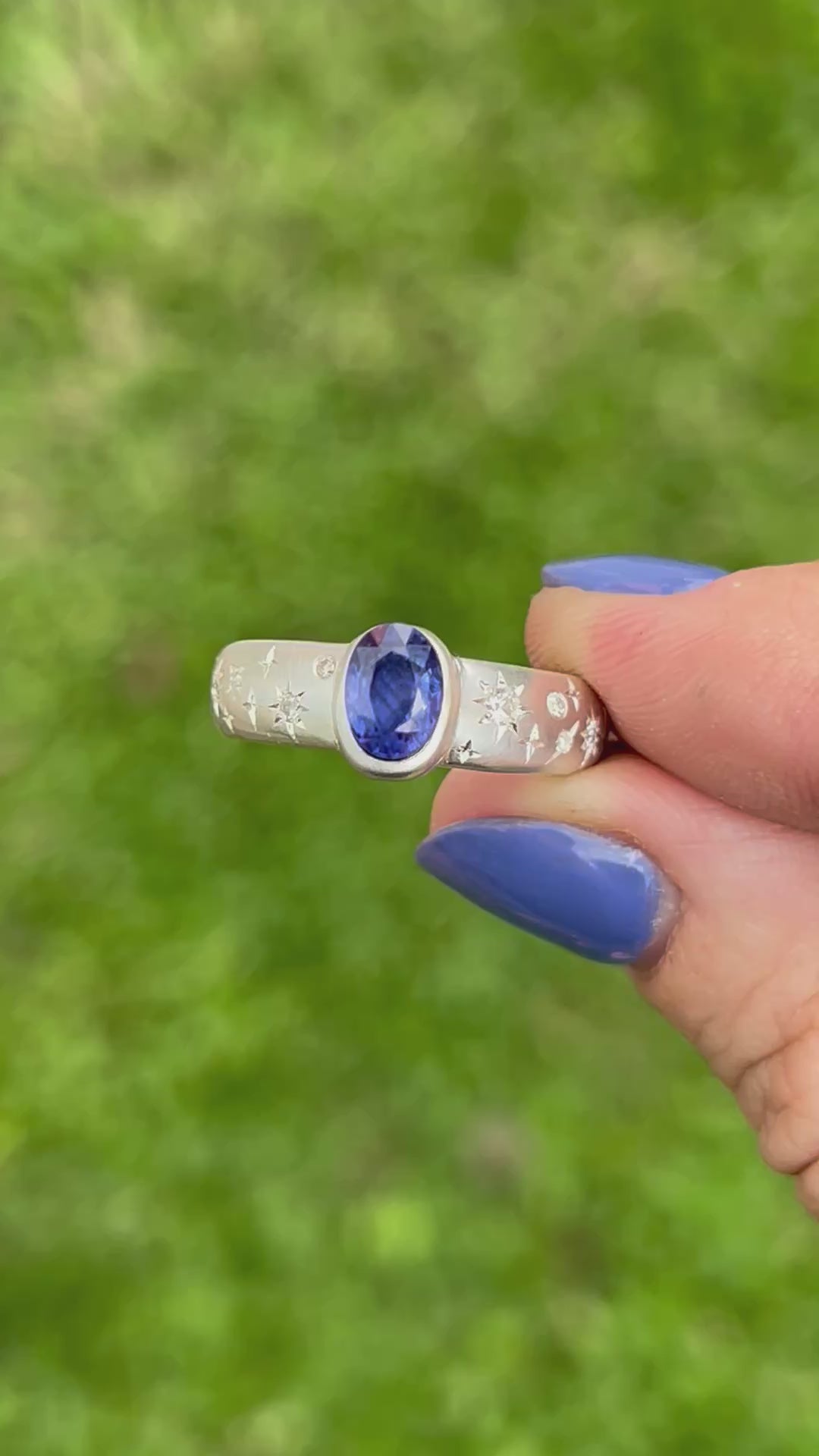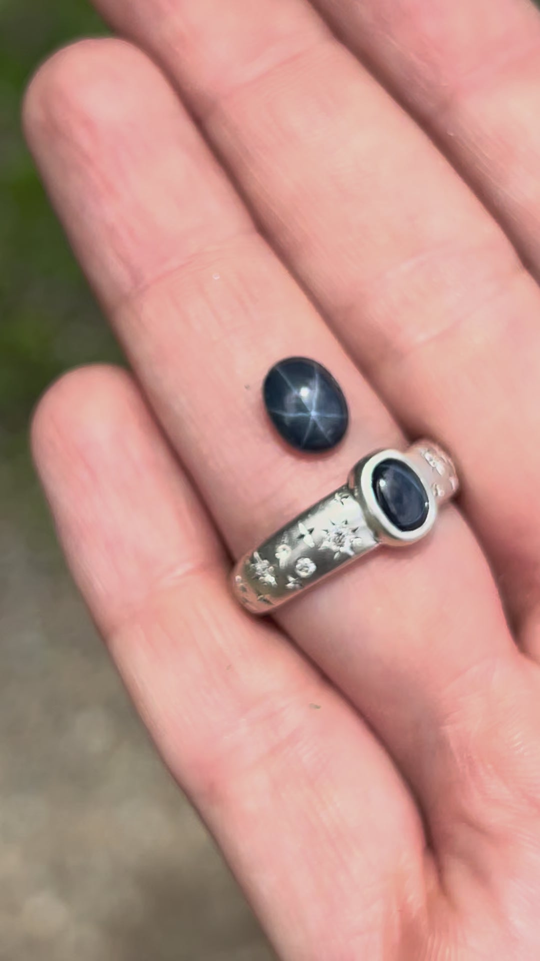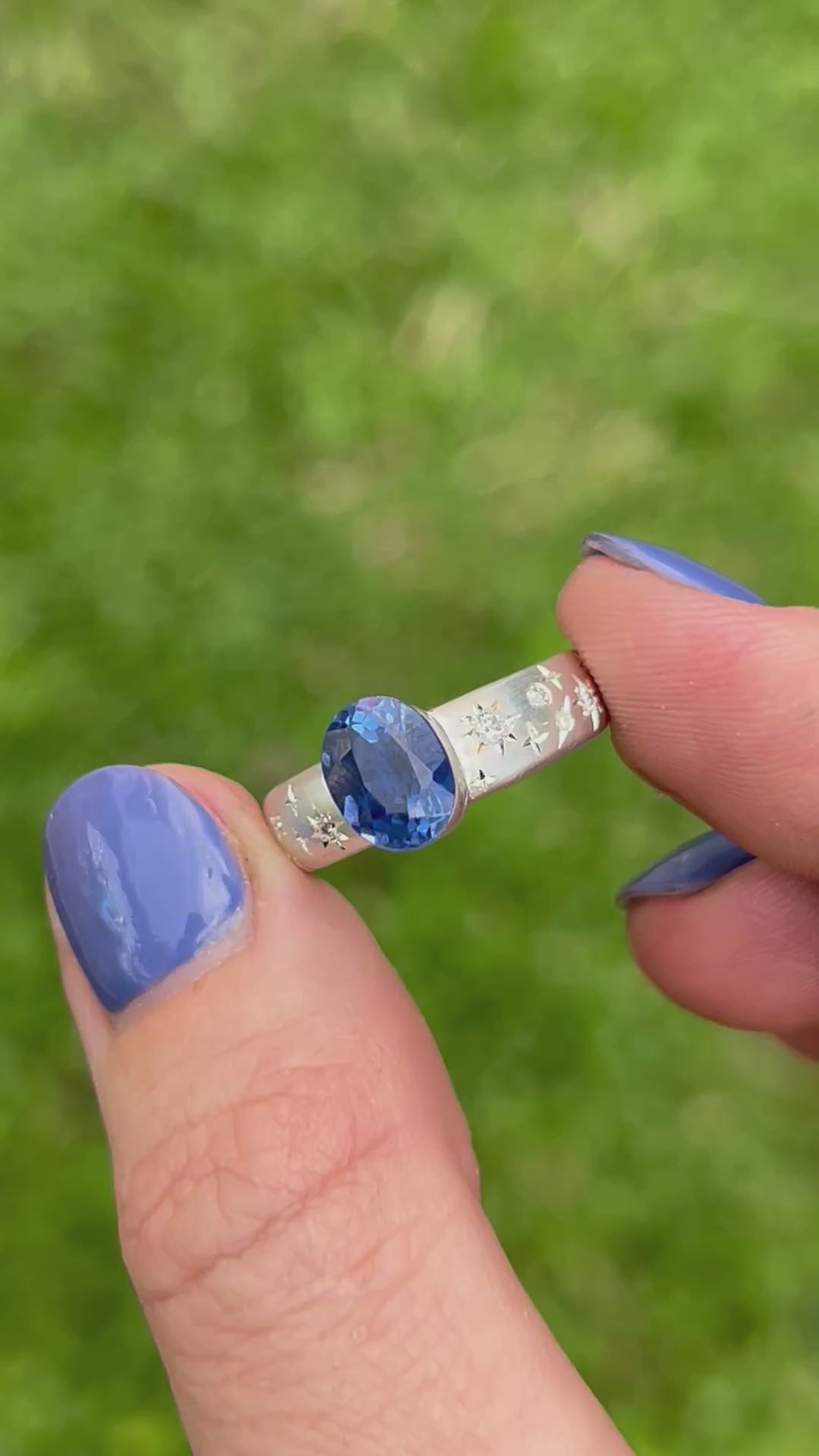 The price reflects the stone set in sterling silver band with 6 lab diamonds scattered on each side amongst an engraved galaxy pattern.