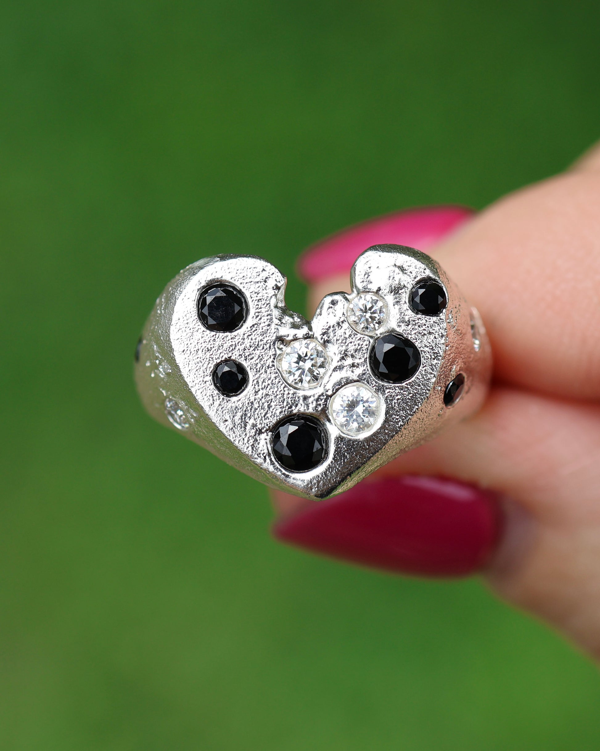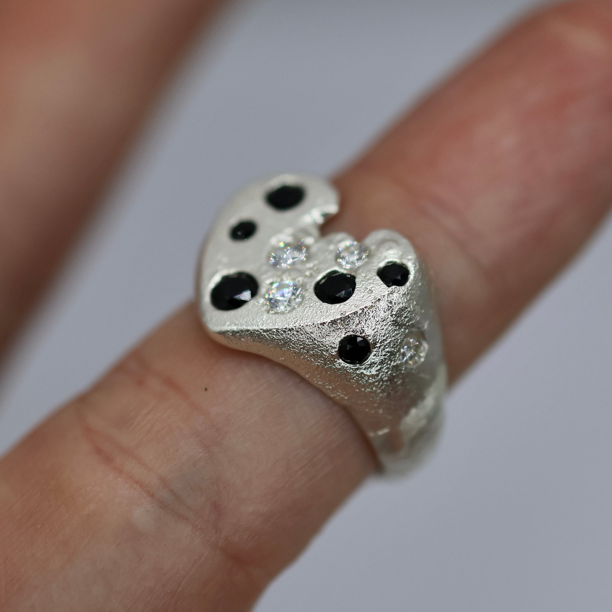 This heart signet is sand cast from recycled sterling silver and features gemstones that have been cast in place and natural sand texture from the casting process.