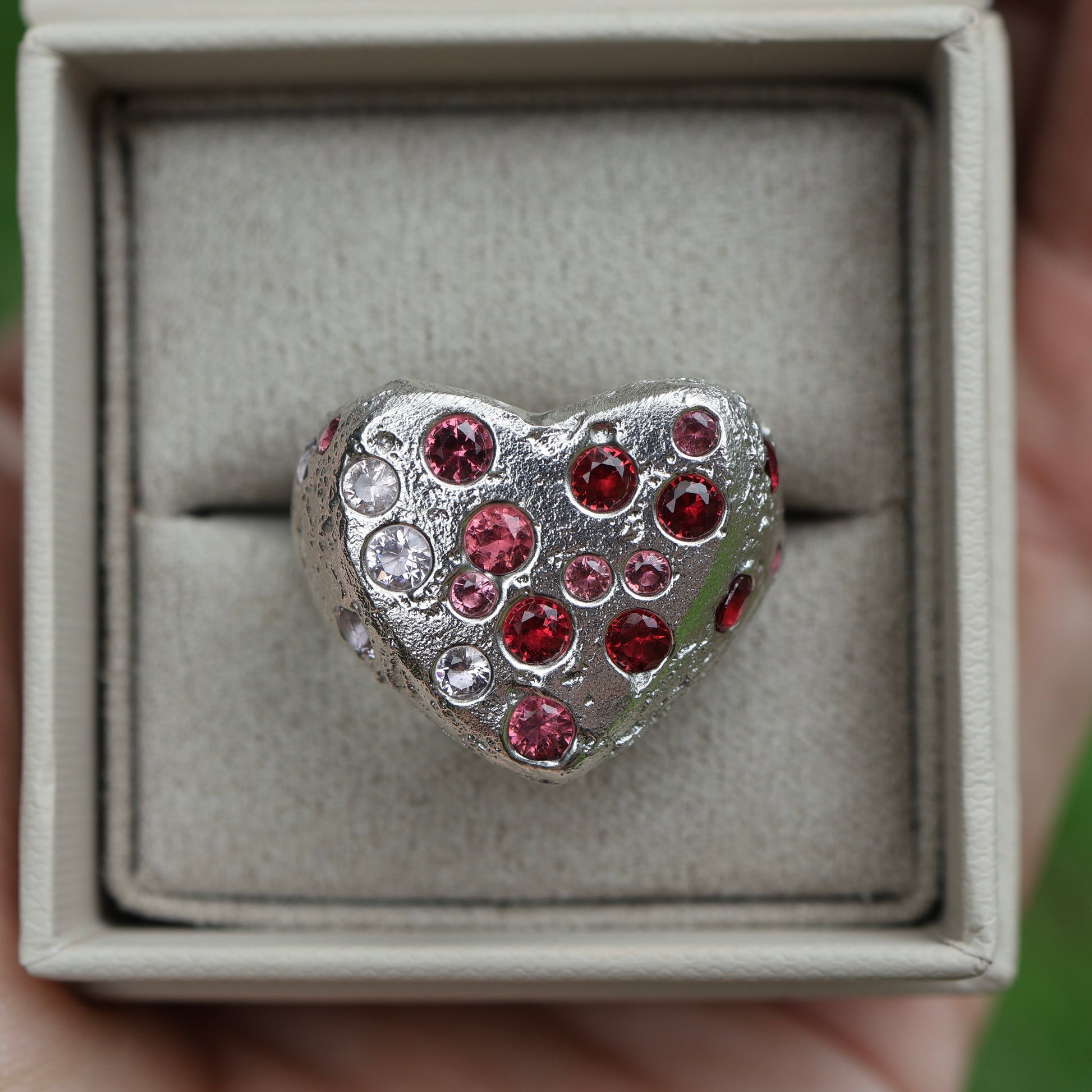 These heart signet rings are made using a process called sand casting. The stones are cast in place which means during the casting process the stones are placed in the mould, molten metal is then poured into the mould wrapping around the stones and securing them in place giving the stones a unique and organic placement.