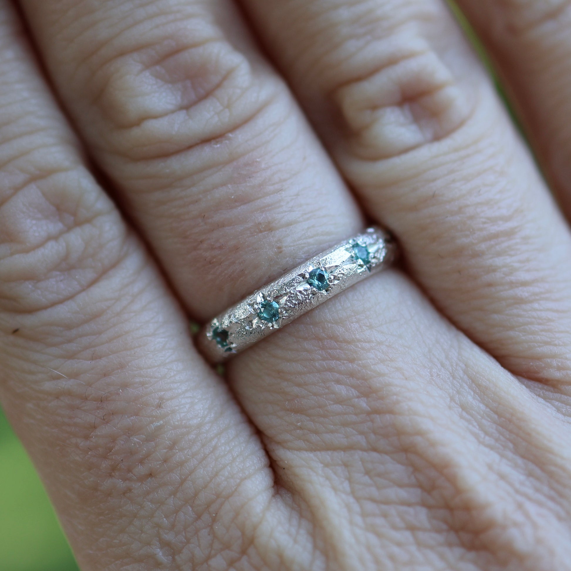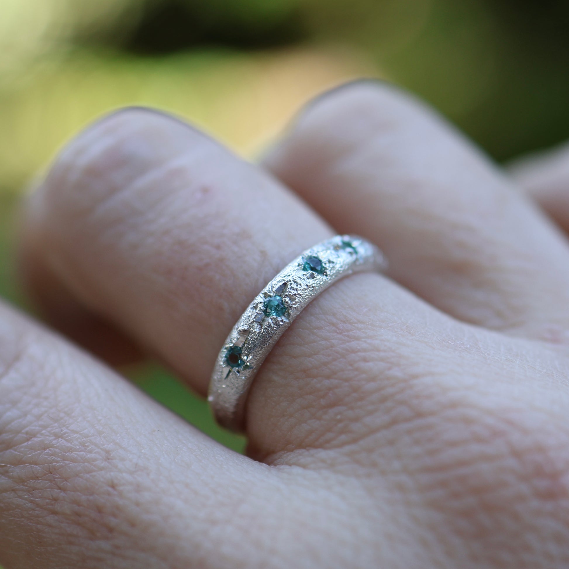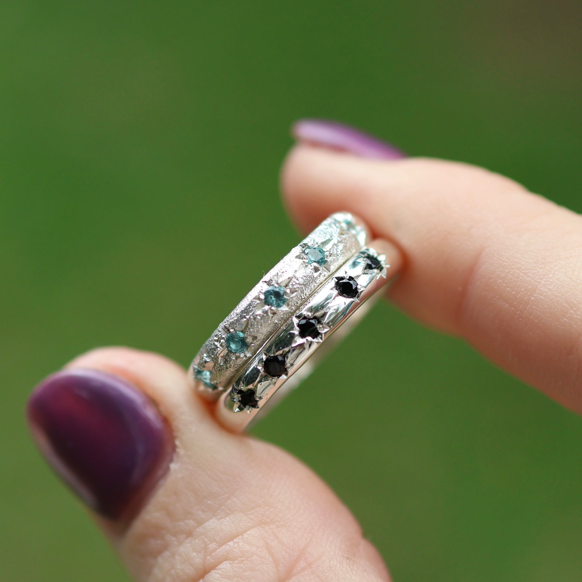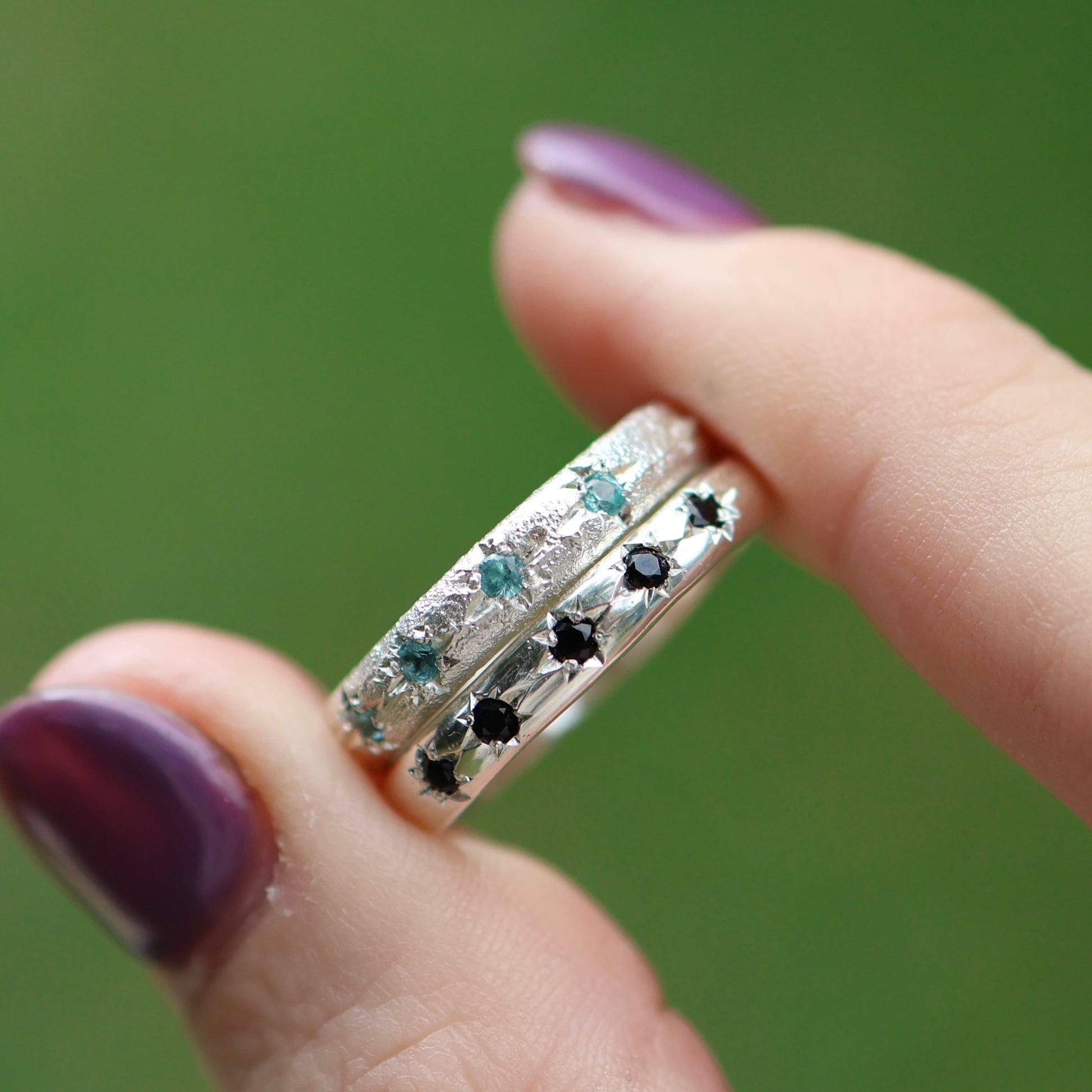 The Astral Hoard rings in the photo are light texture with black tourmaline size 10.5 and the no texture with lab tourmaline size 8 READY TO SHIP. Can be made 1 size larger. They feature 5 x 2mm stones star set in a 4mm band.