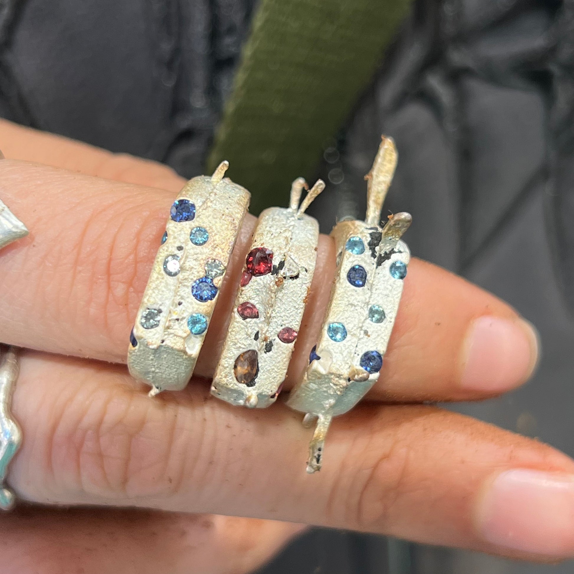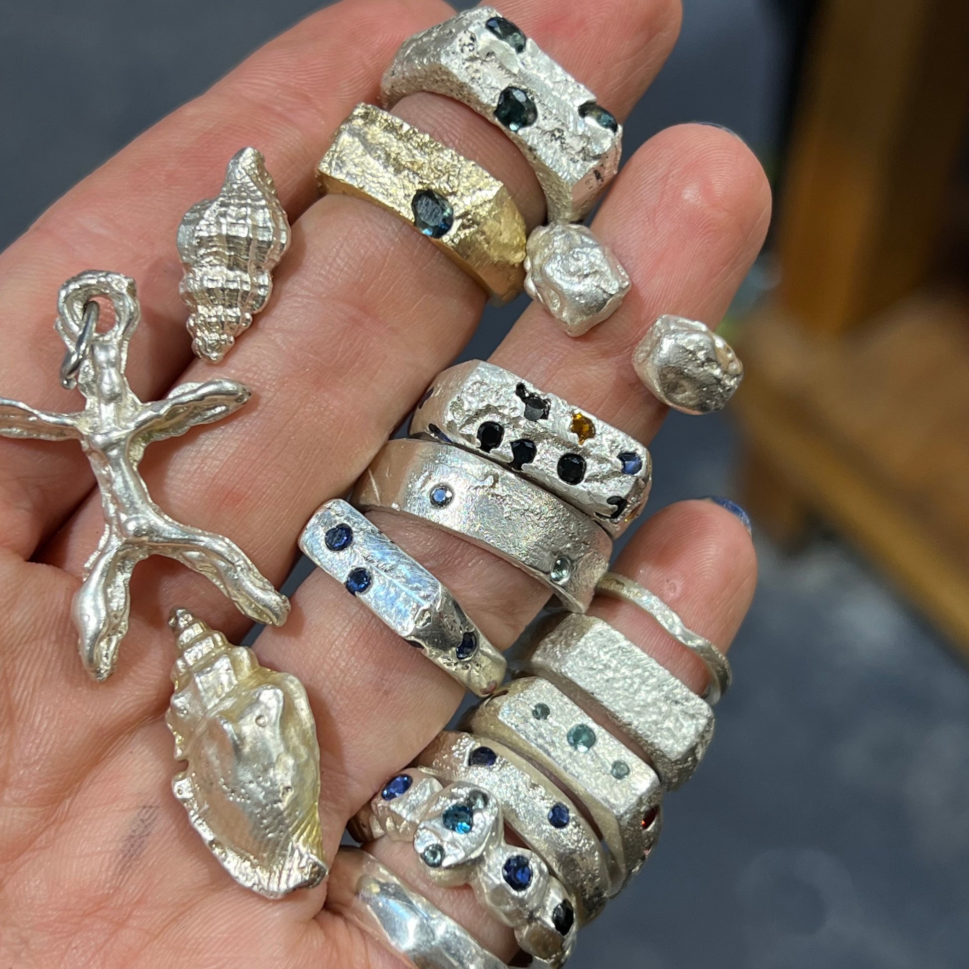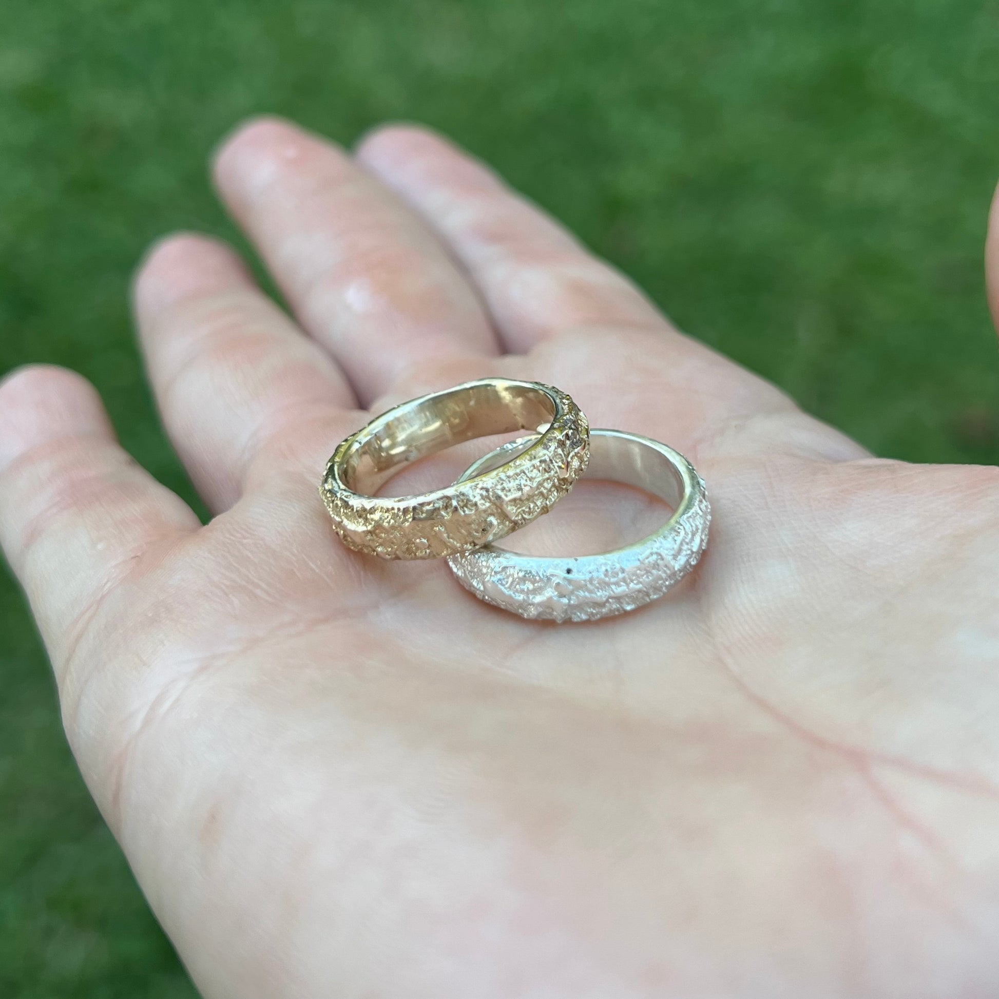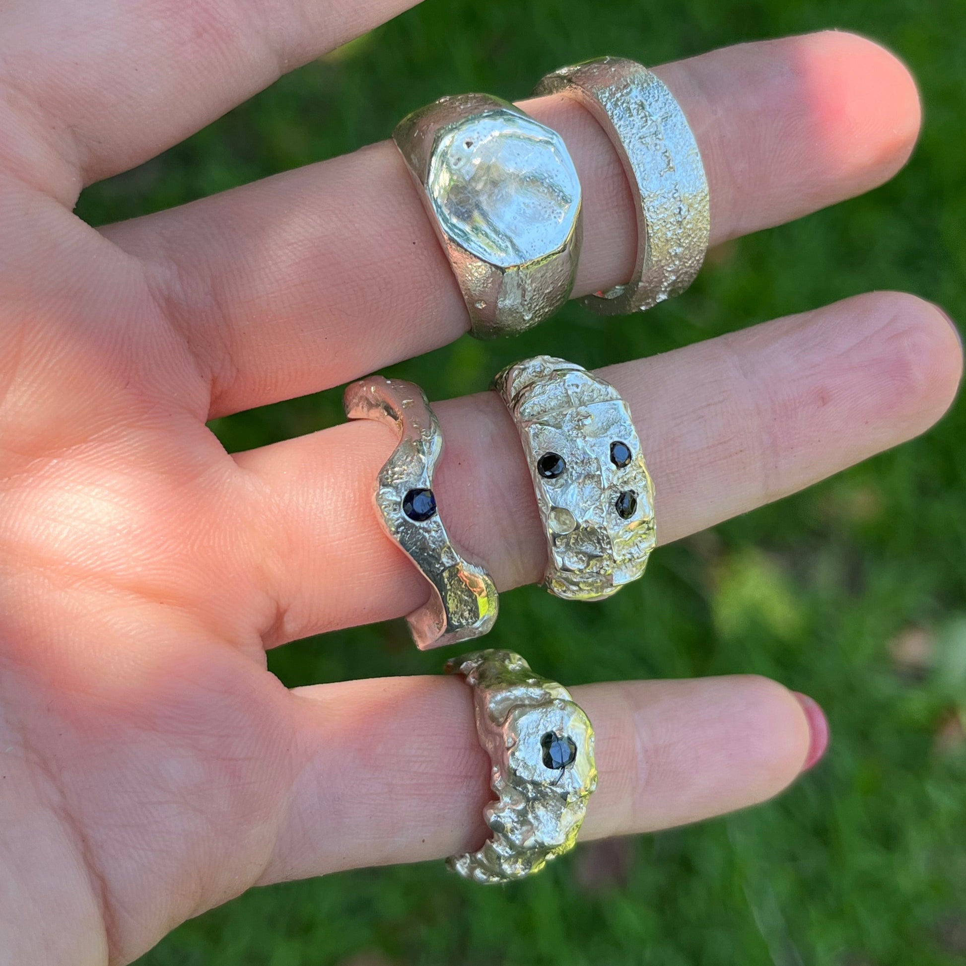Sand casting is a raw, organic process where molten silver is poured into a mould made from sand, capturing the textures, patterns, and imperfections that give each piece its own personality. No two rings are ever the same